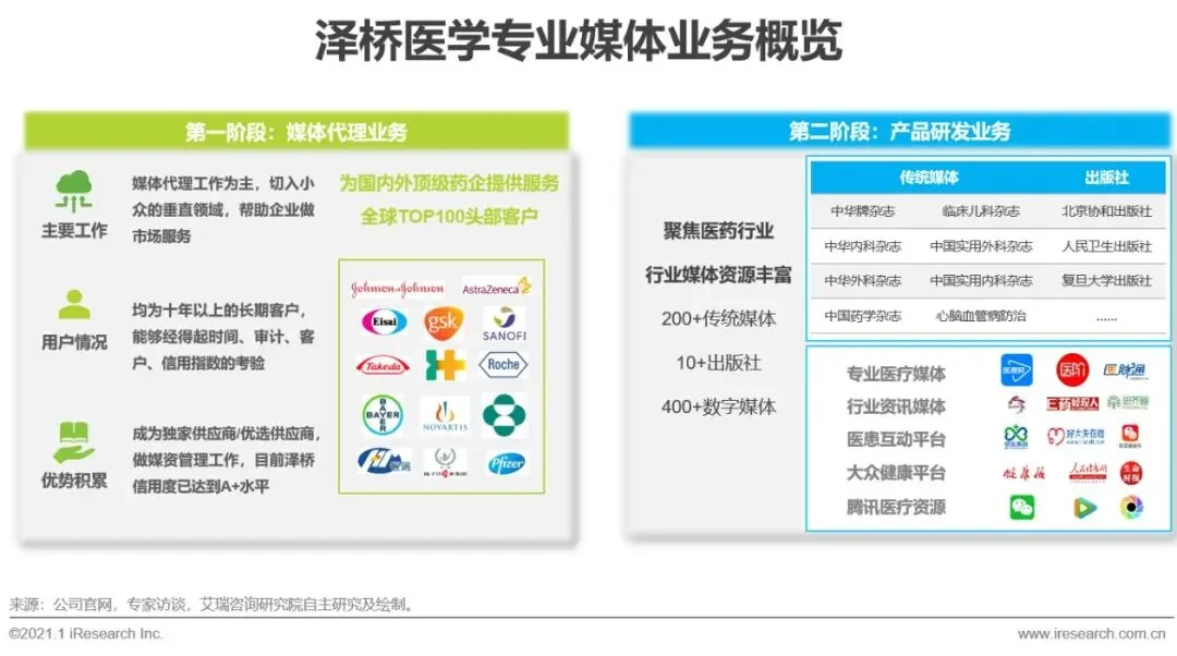 3、泽桥业务布局:在此期间,泽桥先是通过第一阶段的媒体代理业务实现对客户的深度服务,进而走向聚焦医药行业、利用自身媒体资源进行产品研发,抢占了较大市场。