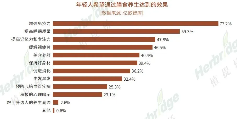 据欧睿数据预测2022年我国功能性食品市场规模将突破6000亿元,而据《Z世代营养消费趋势报告》显示,年轻人成为当下养生消费的主力军,其中18-35岁的年轻消费人群占比高达83.7%,药食同源+滋补类成为新生代消费首选。年轻人希望通过膳食养生进行健康的改善。其中,增强免疫力、提高睡眠质量、提高记忆力和专注力是年轻人的前三大诉求。