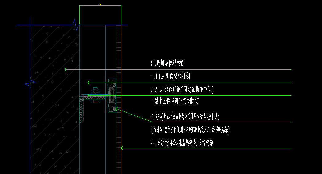 ③T型干挂件和镀锌角钢固定;