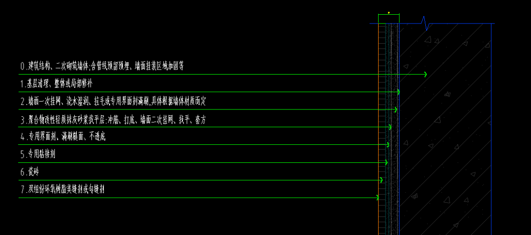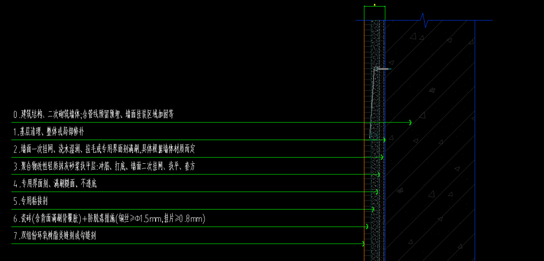 ⑥瓷砖+(含背面满刷背覆胶)+防脱落措施(铜丝≥Φ1.5mm,挂片≥0.8mm)
