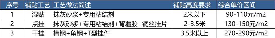 要非常注意不同的铺贴工艺对于铺贴高度的要求,如果在点挂的范围内采用的干挂,则导致成本大幅增加;
