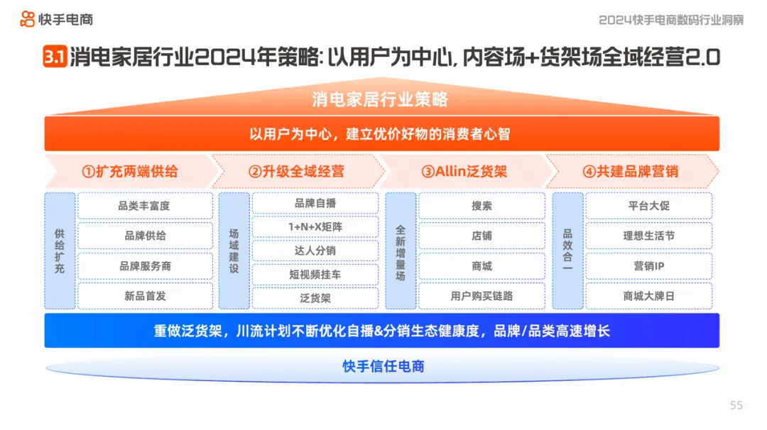 进入2024年,快手电商消电家居行业将以用户为中心,建立优价好物消费者心智。具体来看,行业将充分扩充品类及品牌两端供给,升级全域经营策略,鼓励商家在做好品牌自播、分销、短视频等内容场域以外,拓展泛货架场景,做好搜索、店铺、商城等泛货架场域的精细化运营,同时,借助快手信任社区生态,做好品牌营销,充分参与平台大促、行业营销活动等,提升品牌在快手站内的知名度。