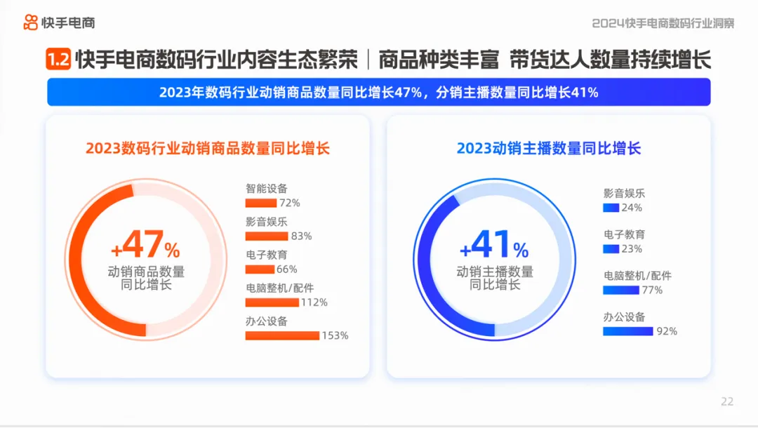 从场域经营上看,快手电商数码行业商品种类和带货达人数量实现双增长,2023年数码行业动销商品数量同比增长47%,分销主播数量同比增长41%,泛货架占数码行业GMV整体的24%,影音娱乐、电脑整机/配件等在泛货架场景GMV同比增速均超100%。
