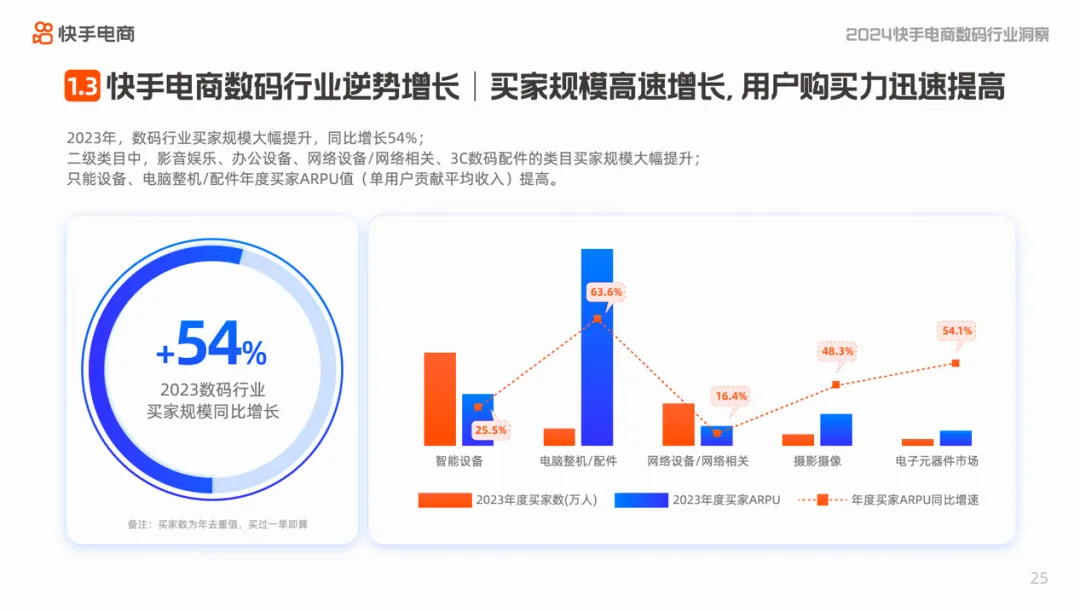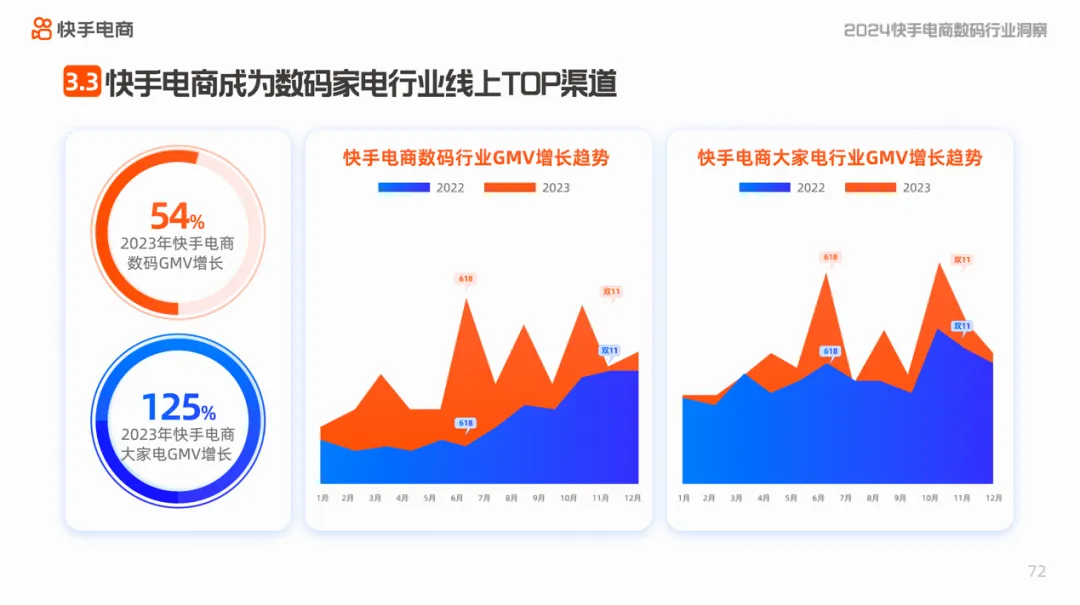 2023年,快手电商数码和大家电行业增长迅速,其中,数码行业GMV同比增长超54%,大家电行业GMV同比增长125%,连续三年实现100%增长。2024年快手电商消电家居行业将以用户为中心,建立优价好物消费者心智,升级全域经营策略,积极引入更多优质品牌和品类,不断丰富供给。
