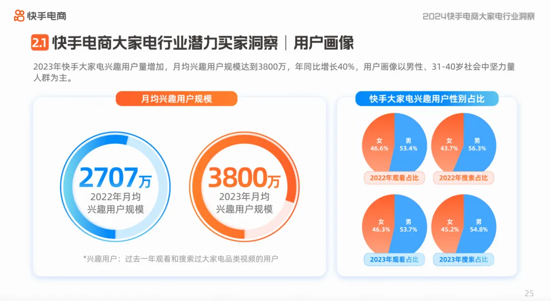 用户规模上看,大家电行业兴趣用户量不断增加,月均兴趣用户规模达3800万,年同比增长40%,其中男性、31至40岁社会中坚力量为核心人群。