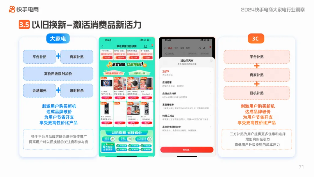 为进一步激活消费活力,快手电商还将推出以旧换新活动,在大家电及3C行业内,通过补贴扶持、活动宣推、增值服务等增强活动曝光力和影响力,带动用户购新消费活力,从而促进消电家居商家销量声量双重爆发。