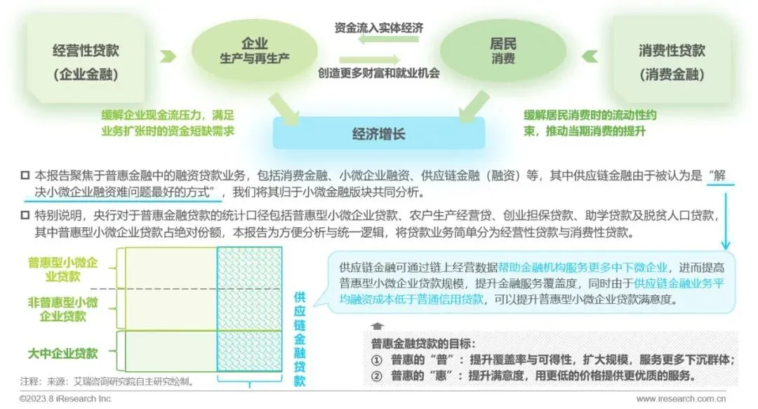 《报告》率先给出了普惠金融的定义,特别聚焦普惠金融的贷款领域,对报告重点分析的几个板块间的关系进行了梳理,同时简明扼要对消费性贷款和经营性贷款对经济的作用给出结论:1)消费性贷款通过缓解居民消费时的流动性约束来推动当期消费的提升,居民消费资金流入实体经济;2)企业实现生产与再生产,经营性贷款在过程中缓解企业现金流压力、满足业务扩张时的资金短缺需求。