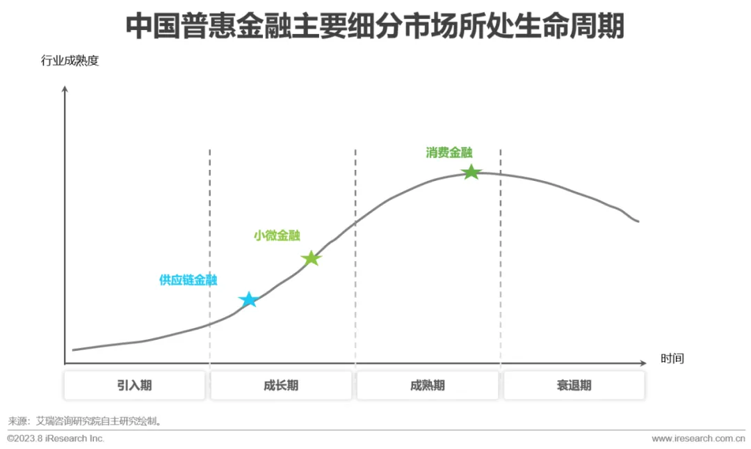 最后,「普惠金融篇」以不同细分市场所处行业生命周期的结论引出了对剩余三部分内容的分析:消费金融已步入成熟期,小微金融处成长期快速增长,供应链金融初入成长期亟待爆发。