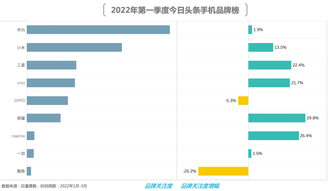荣耀是本季度关注度环比增长最快品牌,Magic V、Magic 4系列的发布也吹响了今年荣耀在高端领域进攻的号角。三星、vivo与荣耀情况类似,凭借新机的影响力使得品牌关注度涨幅保持在20%以上,值得一提的是,三星在国内市场的关注度逐渐提高,尤其是Galaxy S22系列的问世,使得三星品牌排名取得新高。