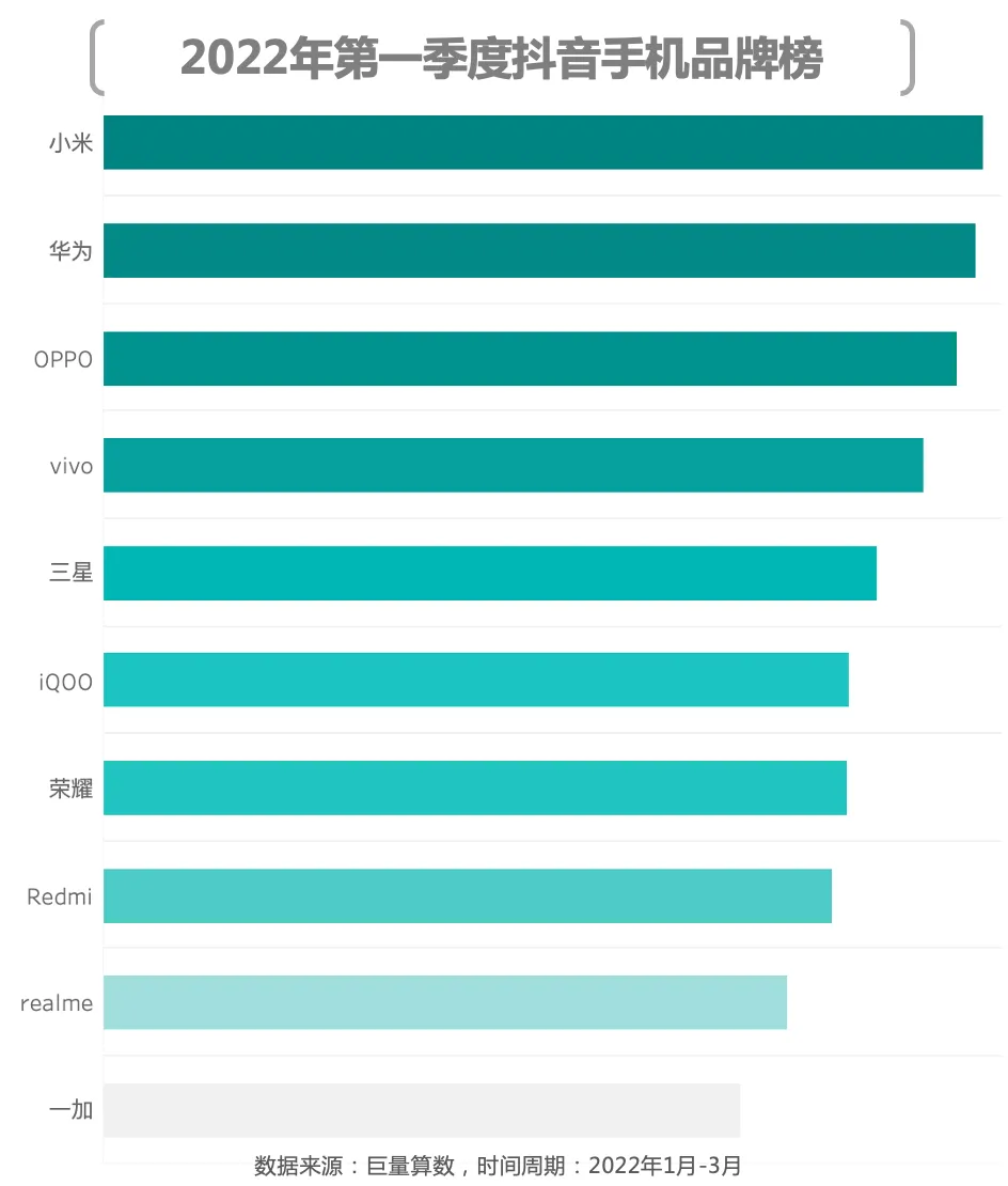 相较于上季度,本季度抖音手机品牌榜最大的变化是小米。上季度末发布的小米12系列热度在本季度开始发酵,助力小米登上抖音手机品牌榜榜首。除此之外,Redmi凭借着Redmi K50系列稳住了上季度排名。