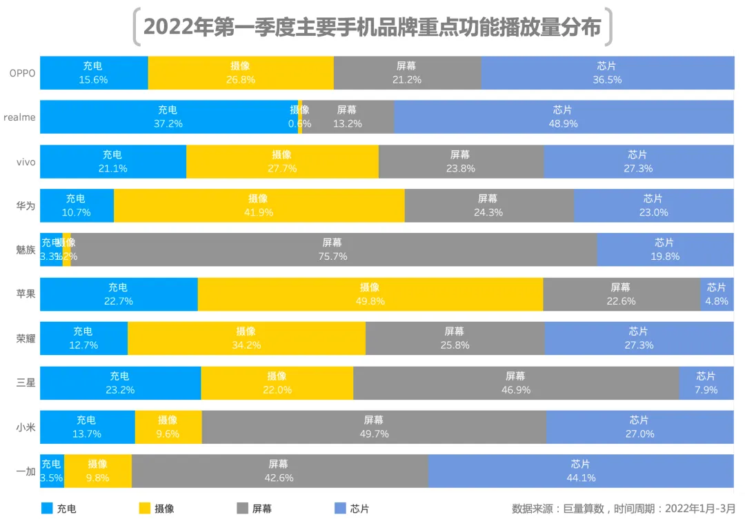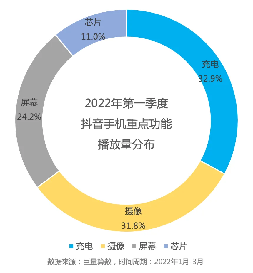 从以往数据来看,用户对于手机功能的关注方向依然集中在充电、摄像、屏幕、芯片等核心功能领域。而在本季度中,充电与摄像占据了手机重点功能播放量的六成以上。
