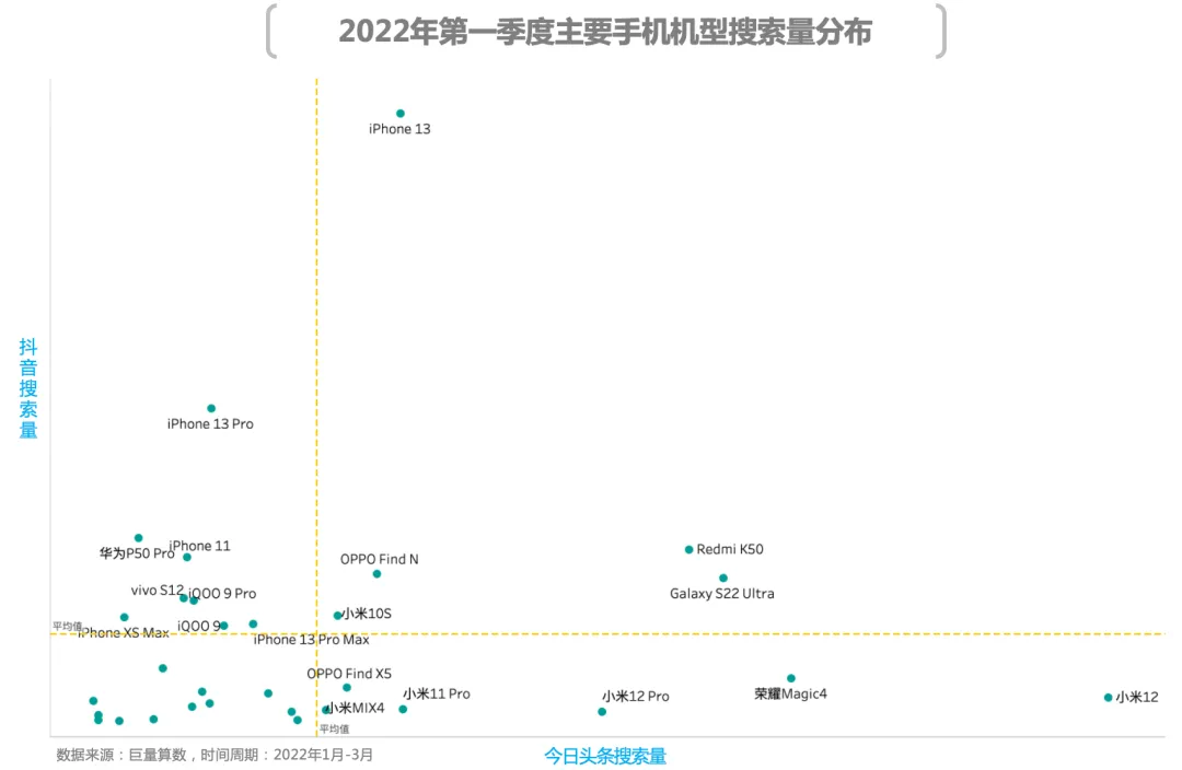 从具体机型的用户搜索表现来看,iPhone 13、Galaxy S22 Ultra、Redmi K50以及OPPO Find N等机型在今日头条与抖音均受到用户的高度关注。但更多的机型则属于“偏科生”,例如:小米12系列、荣耀Magic 4等机型在今日头条中搜索量排名前五,而在抖音中的排名远不如其在今日头条中的表现;而抖音则成为iPhone的部分机型、华为P50以及iQOO 9 Pro等机型的“主场。”