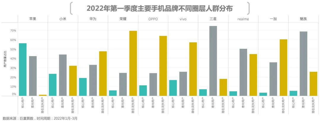 从本季度各个品牌人群圈层分布看,苹果拥有的核心用户数量稳居行业首位,同时其潜在流失用户在所有圈层用户中的占比也远低于其他品牌。