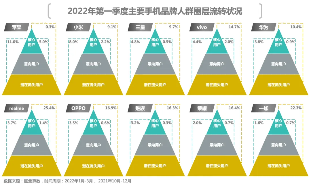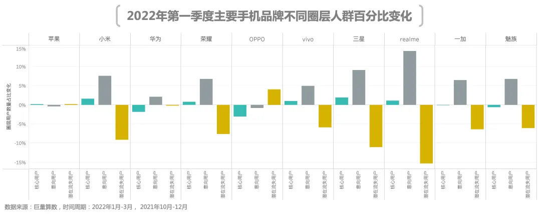 从两个季度主要手机品牌不同圈层人群占比变化来看,大部分品牌呈现出了核心、意向用户占比增长,潜在流失用户占比下降的趋势。而出现此现象的原因主要有二: