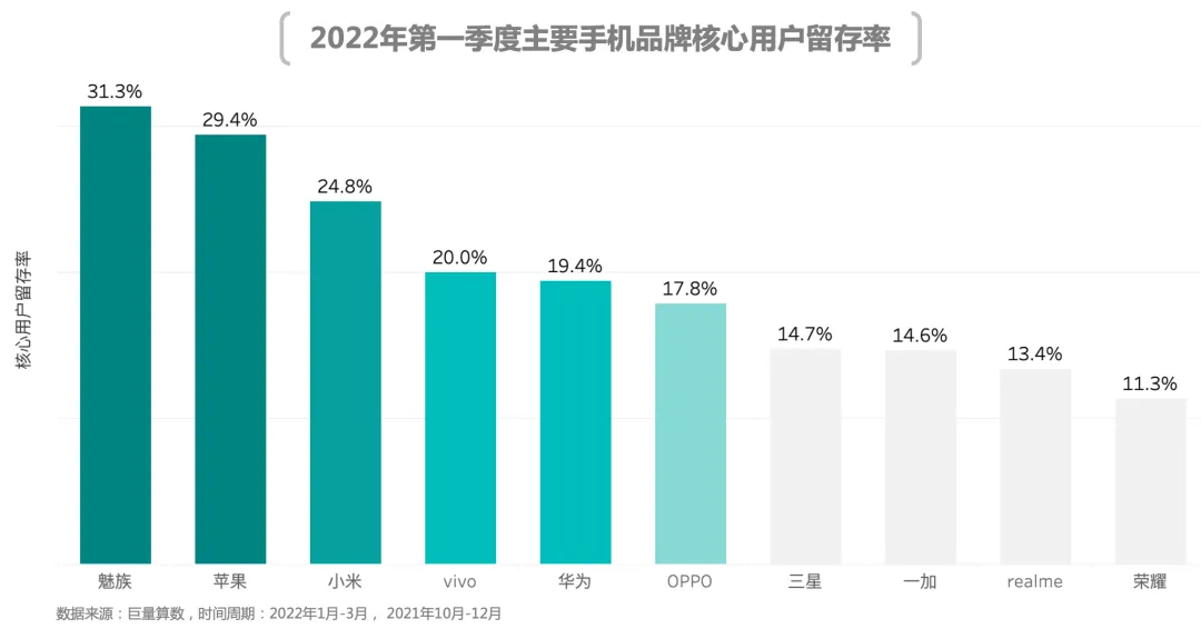 2022年第一季度,魅族拥有着最为稳定的核心用户,留存率居行业首位。然而受制于存量用户规模,魅族当前的任务更多的是如何获取新用户,扩大用户规模。