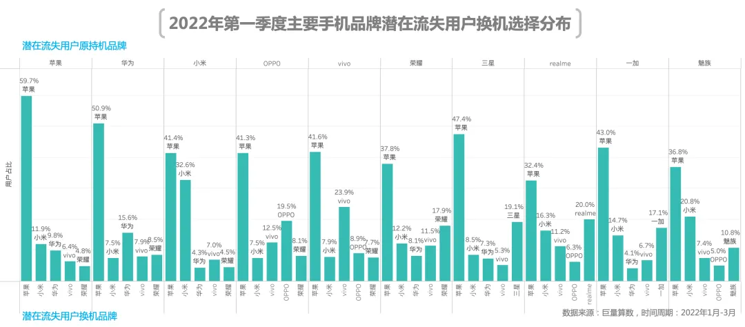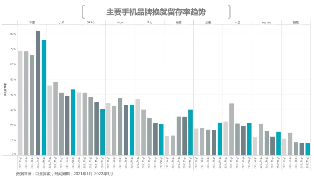 2022年开年,多个品牌的高端旗舰便纷纷亮相,然而在苹果强大的产品里面前表现虽有进步,但依然有着一定差距。因此大部分国产品牌换机留存率相较去年同期均出现一定程度下滑。