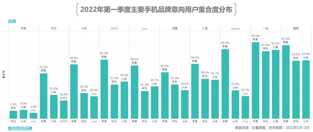 从数据看,苹果意向用户有着更高的忠诚度,意向重合率最高的品牌为小米,重合率仅为8%。除此之外,苹果对于其他品牌意向用户有着非常高的吸引力,其他品牌与苹果的意向用户重合率均在40%以上,而realme、一加、魅族与苹果的意向用户重合率甚至超过60%。