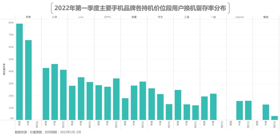 1、换机留存率:苹果用户忠诚度超70%,小米用户换机留存率居国产品牌之首