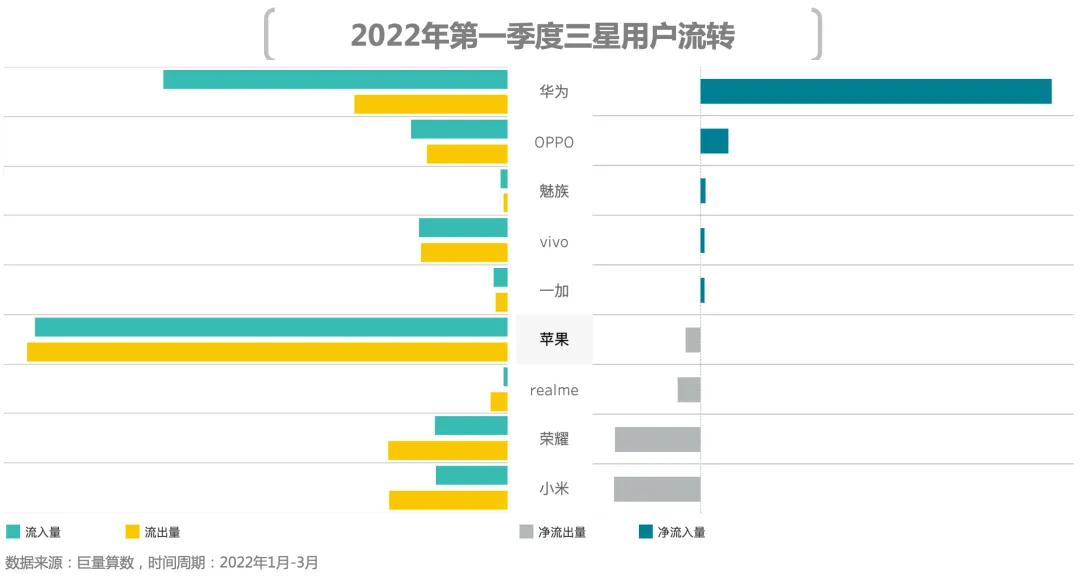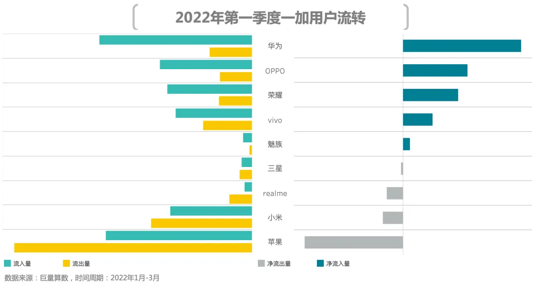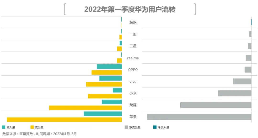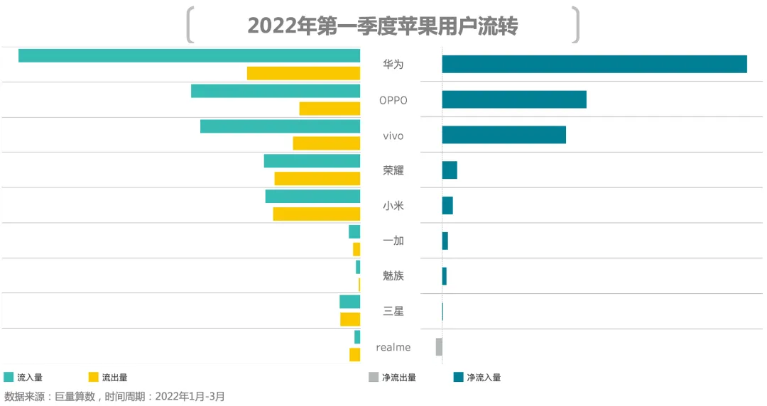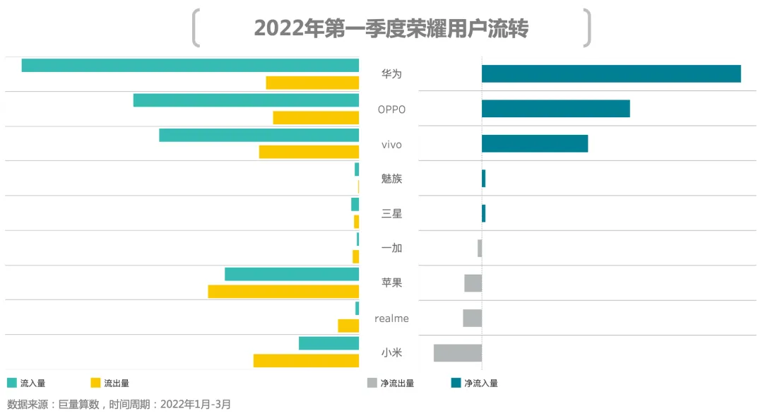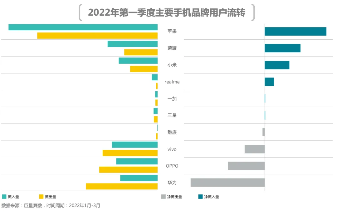2、用户流向:苹果卫冕净增用户量首名,荣耀净增用户量领跑国产品牌