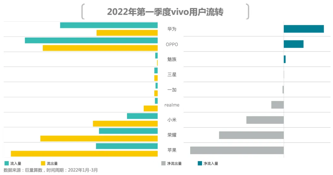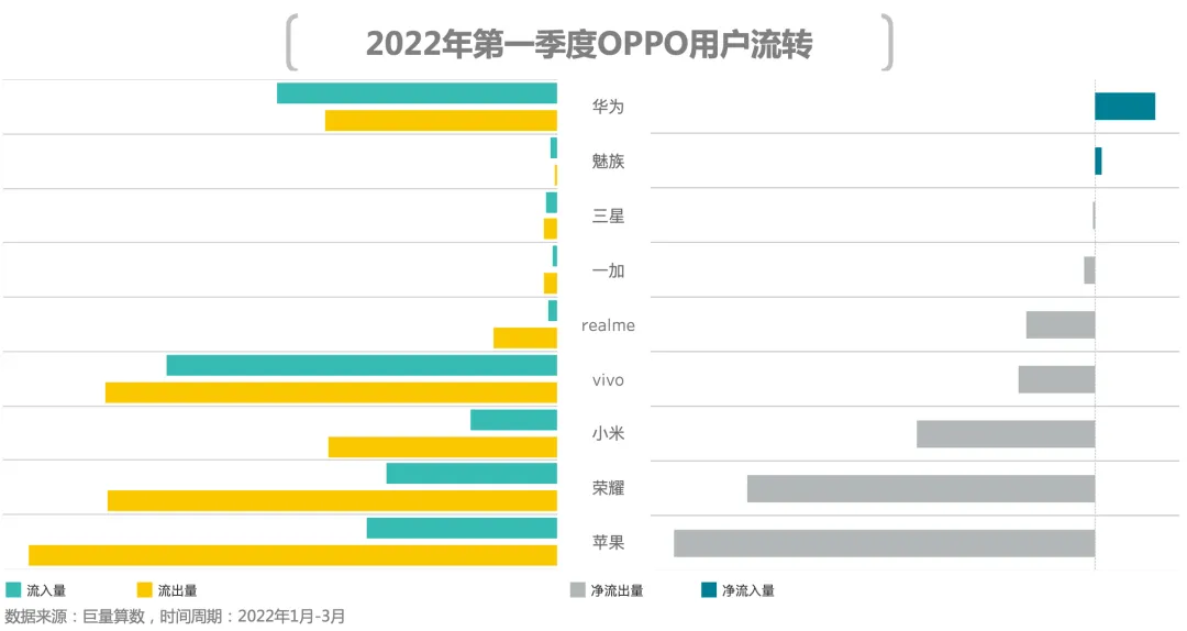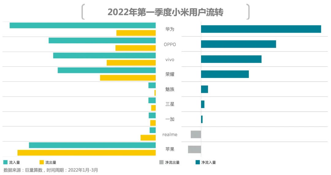 有时候市场竞争是错位的。在很长一段时间内,OPPO与vivo将小米作为主要竞争对手之一,而在本季度中,荣耀开始“偷塔”,荣耀已经成为OV用户净流出量第二多品牌;反观荣耀,单从用户流入流出状况看,其最大竞争对手是小米。