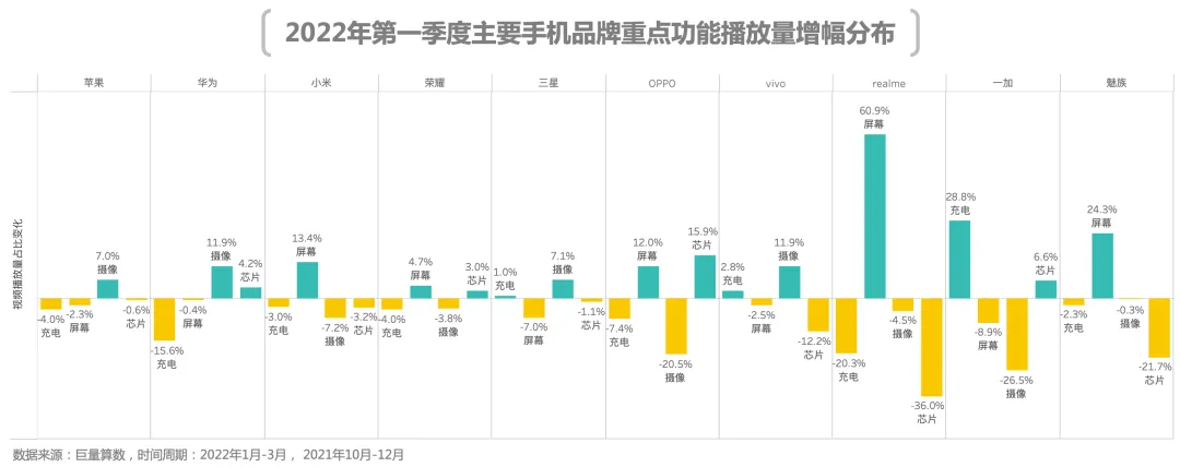 数据显示,超半数品牌本季度屏幕功能相关视频播放量有所增加,而有六个品牌摄像功能相关视频播放量有所减少。