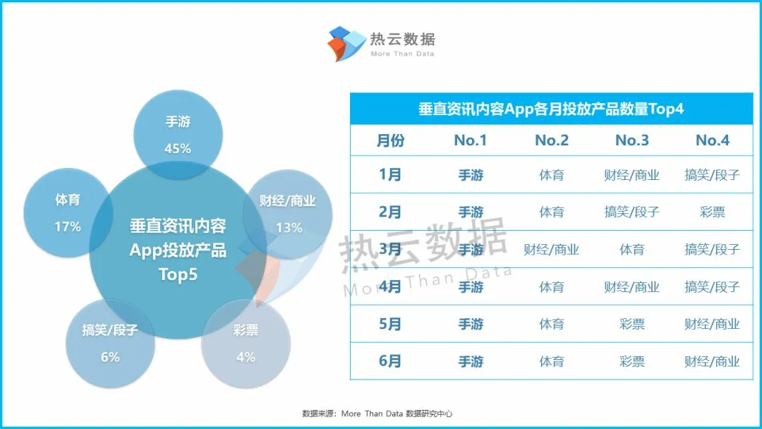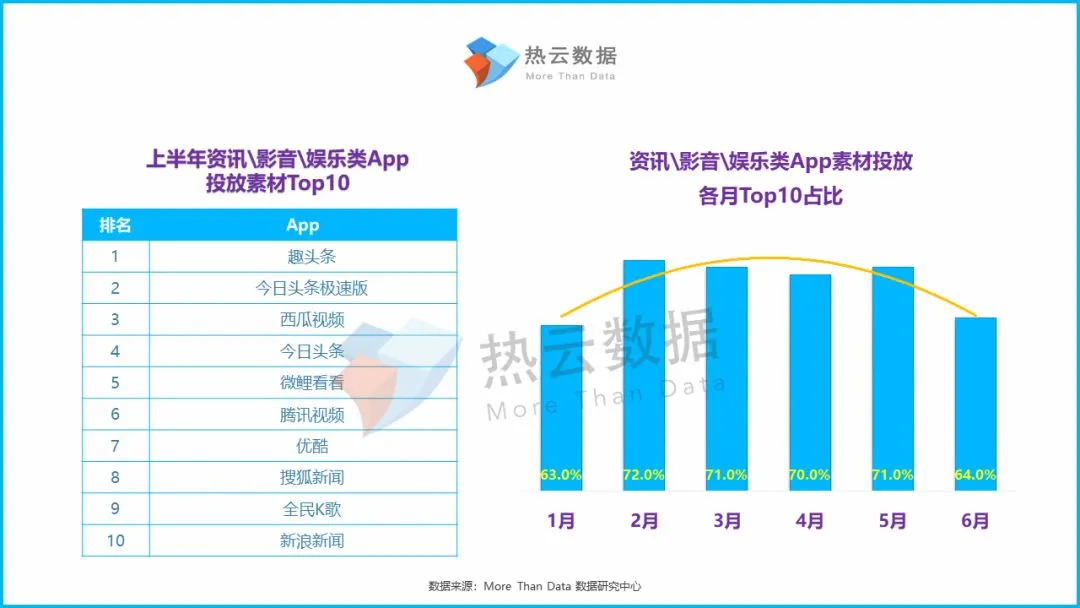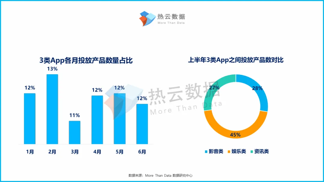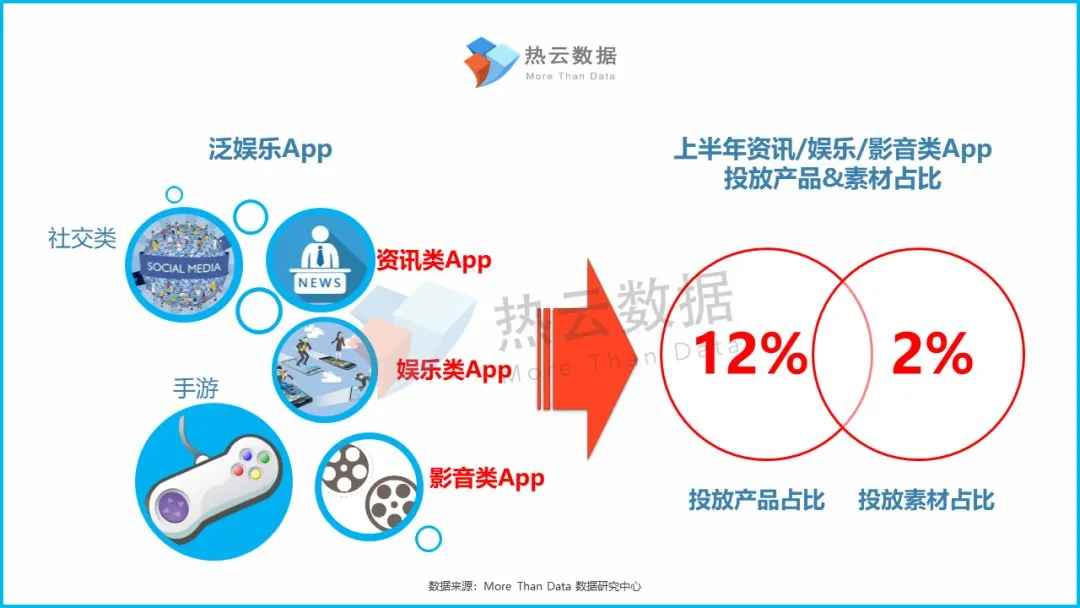 根据热云数据Adinsight产品监测,2019上半年共监测到资讯类、娱乐类以及影音类App近300款产品的投放数据。该总体投放产品数量占所有应用App数量的12%。相比之下,按投放素材丰富程度来看,上述3类App投放素材数量仅占整体应用App的2%。