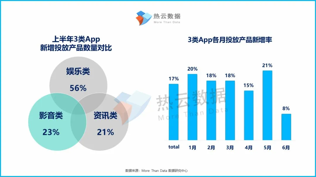 按3类应用新增投放App维度来看,上半年共有近百款新增App,总体新增率为17%。其中,娱乐类App仍为最多,比例为56%。因此,结合上述3类总体投放产品数量分布来看,上半年娱乐类App成为投放产品的No.1与其上半年新增产品存在着一定关系。另据右图各月新增率情况来看,1月与5月是新增率最高的两个月份,比例达到20%或以上;而6月份的新增率却迎来了断崖式下跌,新增率仅为8%。