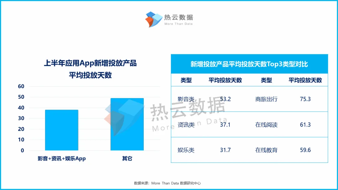 上半年新增投放的影音、资讯以及娱乐类App平均投放天数为38天,低于其它新增应用App的平均投放天数。其它新增应用App类型中,商旅出行类App是上半年平均投放天数最高的类型,达到75天;其次是在线阅读以及在线教育类App。这3类泛娱乐新增App中的影音类App是上半年平均投放天数最高的类型,达到53天;资讯类App次之且比影音类新增投放App缩短了16天;娱乐类App虽投放产品的新增率是3类App中的No.1,但却是3种App类型中平均投放天数最低的,仅约32天。相比之下,娱乐类的新增App投放主要以“短、平、快”套路为主。