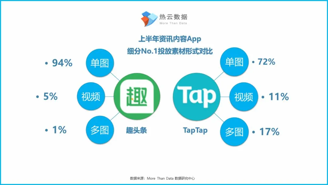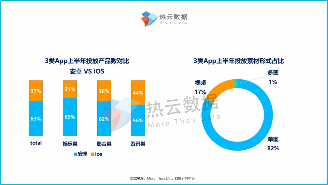 上半年3类泛娱乐App在双设备投放产品数量的对比来看,总体上安卓上投放产品占比明显高于iOS。其中,基于苹果App Store相关上架政策原因,娱乐类App因涵盖大量“手游试玩平台“等App,其在iOS设备上的占比明显低于安卓,比例仅为31%;资讯类是3类App中两设备投放产品数量较为平均的App类型。此外,3类App在上半年投放的素材仍以单图形式为主,其占比高达82%。