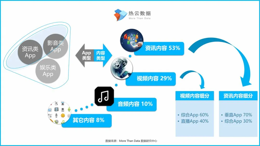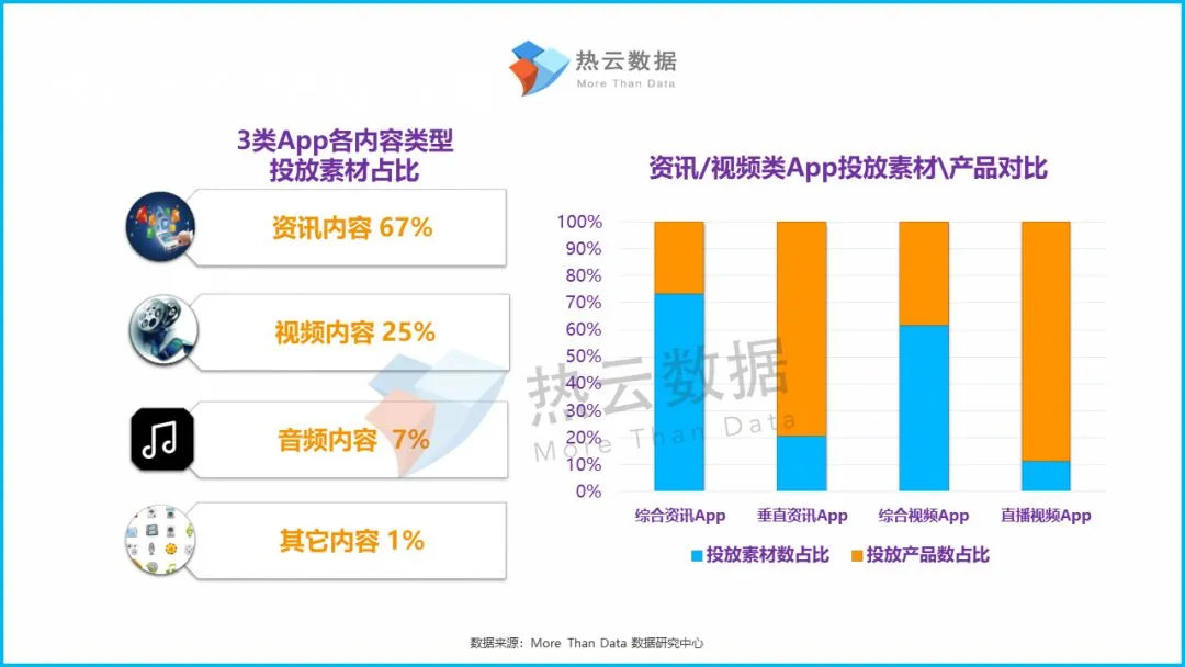 上述3类应用App,根据其App产品内容与形式,分为“资讯类、视频类、音频类以及其它”四种内容类型。其中,资讯内容类App是投放产品数量占比最高的,占比达到53%,视频内容类App接近3成,排在第2。按上述两类内容App的细分来看,视频内容中综合类App投放数量为6成;而资讯内容中的综合类App占比仅为3成,相比之下更多的是各垂直行业资讯App。