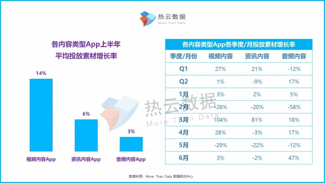按投放素材增长率来看,视频内容虽在总体占比上仅为四分之一,排名位居资讯内容之后;但在2019上半年投放素材增长率的维度上,却以平均14%的投放素材增长率成为上半年投放素材增长量最高的App内容类型。其中,视频内容App主要来自于Q1的增长;而Q2增长率最高的音频内容App。