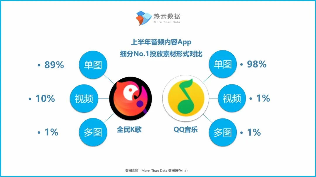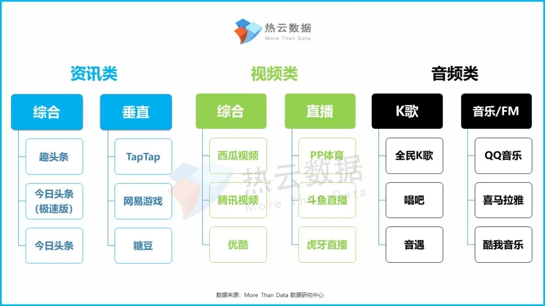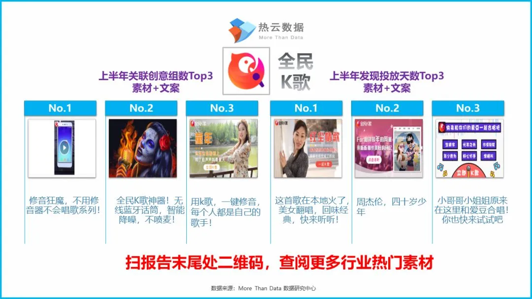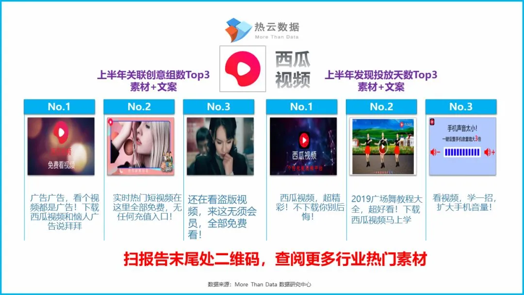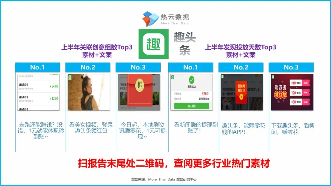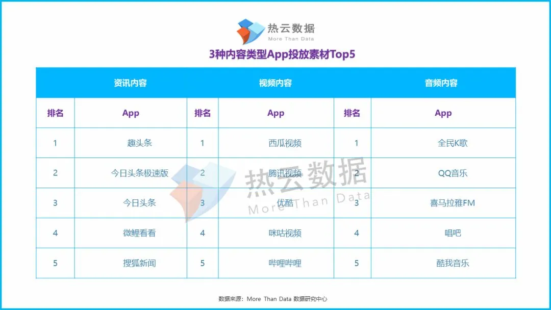 以下是按此前提到按App主要交付内容形式划分投放素材Top5的App名单,其中趣头条、西瓜视频以及全民K歌分别是资讯以及视\音频内容投放素材量最高的3款App。(扫描报告结尾热云小助手二维码并添加好友,获取完整版报告,即可了解“3种内容类型App投放素材Top10”)