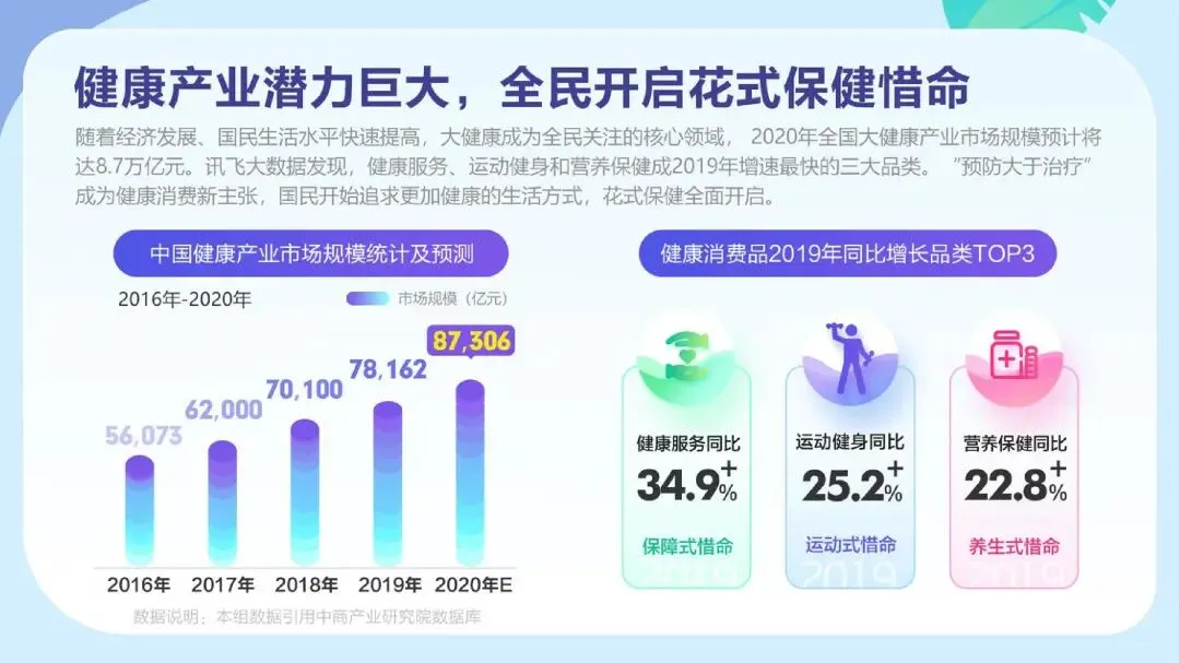 随着国民对健康领域的关注度提升,“预防大于治疗”成为用户健康消费新主张,以预防为主的各类健康保健方式得到追捧,大健康领域将迎来一轮新增长。
