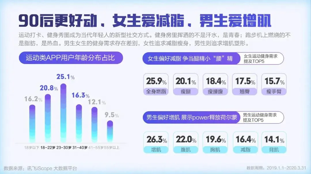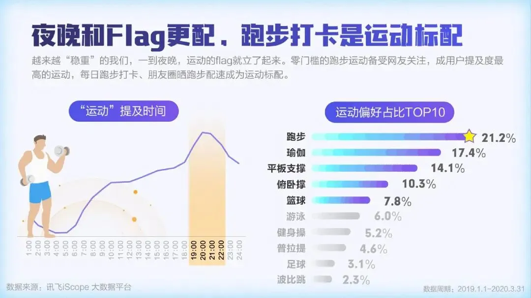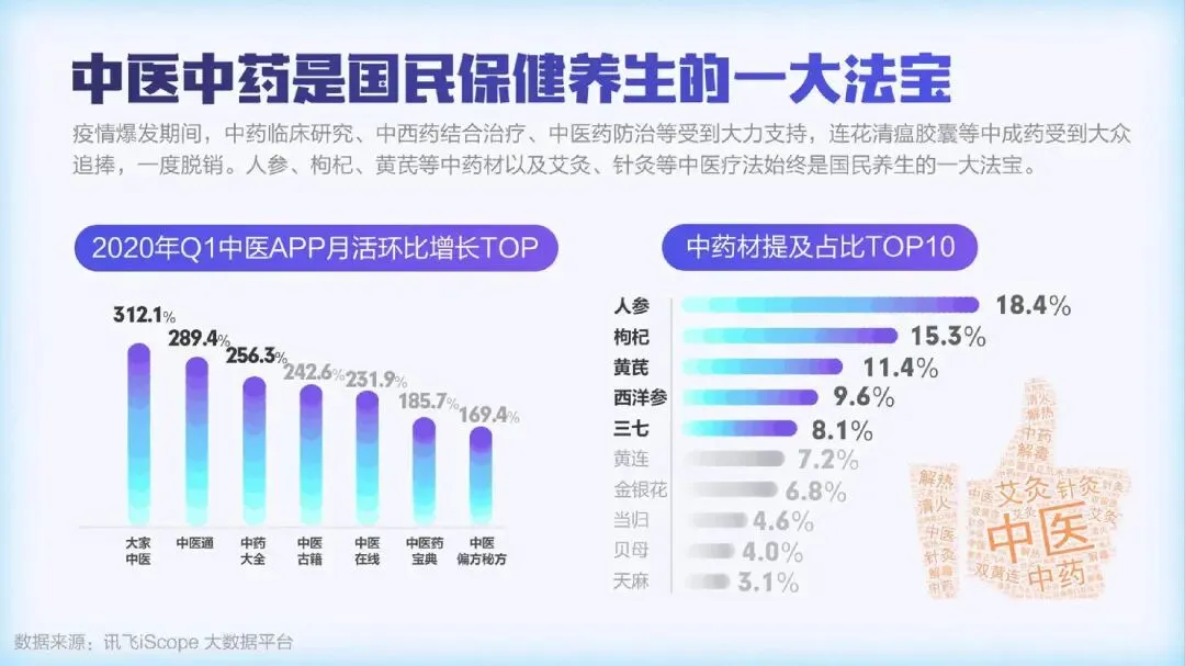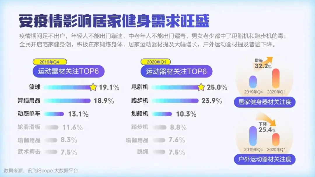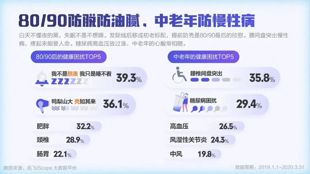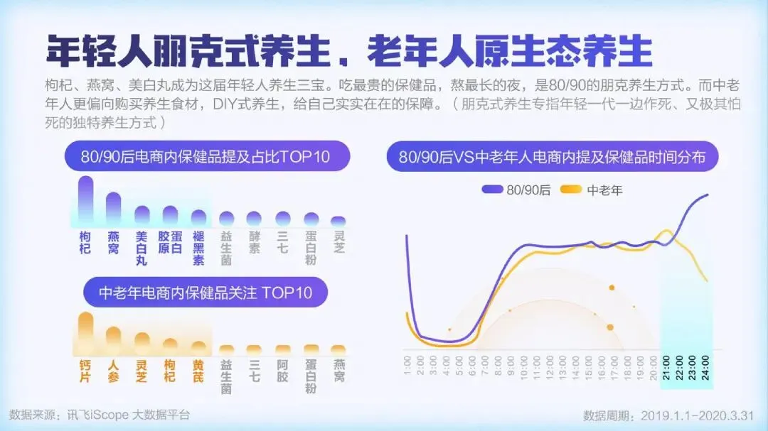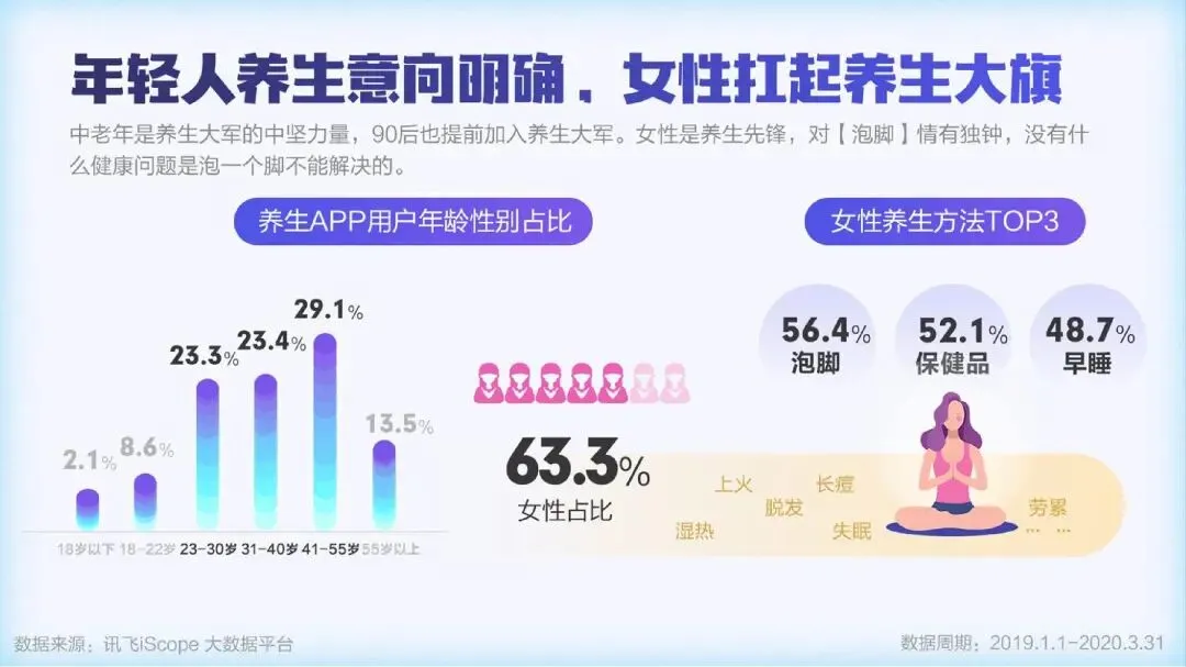 疫情期间,全民开启了宅家健身的热潮,居家运动器材的提及量大幅增长,“甩脂机”、“跑步机”、“划船机”成为最受关注的三大运动器材。人们在家运动健身的需求产生明显增长,“健身直播课”、“线上私教”等纷纷上线。随着人们健康意识的提升,保温杯里泡枸杞已不再是中老年的专利。越来越多的90后开始加入养生大军。女性用户占比达到63.3%,“泡脚”、“保健品”、和“早睡”成为最受女性欢迎的三大养生法宝。