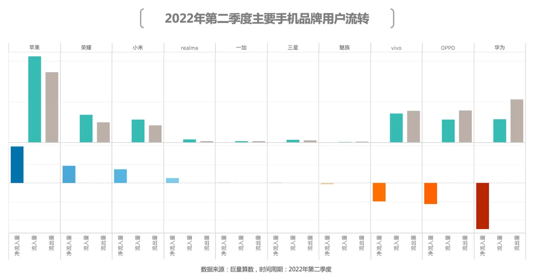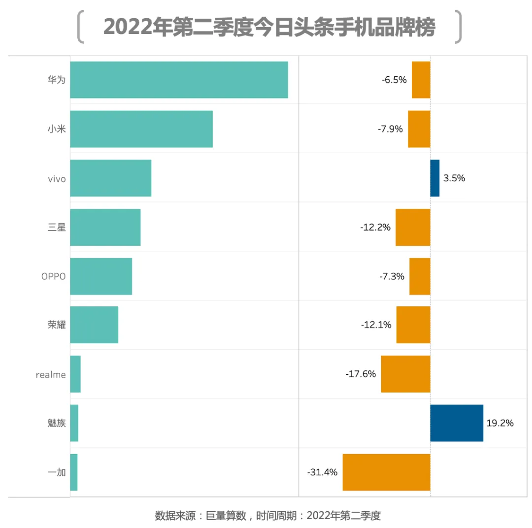 雨过之后并非都是天晴。2022年国内手机行业在经历了第一季的低迷之后,并未迎来第二季度的复苏,相反的,不论是全球市场还是国内市场,手机行业出货量均出现不同程度的同比下滑。根据Canalys公布的数据看,2022年第二季度智能手机全球出货量下滑9%,而2.87亿台的出货量也是近8个季度以来的最低点。从品牌来看,三星、苹果实现逆势翻盘,不论是市场占有率还是出货量,均有不同程度的同比增长。而分列全球出货量3至5位的小米、OPPO、vivo,出货量同比均出现20%左右的下滑。与全球数字类似,2022年第二季度国内智能手机出货量同比下滑10%。在国内手机品牌普跌的情况下,独立回归的荣耀出货量同比逆势增长88%,国内市场占有率达到了19%,位居国内手机市场第二。而荣耀的强势回归,势必会对其他国内品牌带来强大冲击,部分品牌出货量同比下降了30%,而市场占有率下降了5%。值得注意的是,在如此的环境之下,上半年无一新机发布的苹果在国内市场出货量同比增长25%,这也为各个冲击高端的国内厂商敲响了警钟。不同于销售市场以数字定输赢,内容平台上的竞争显得更为错综复杂。巨量算数通过对手机行业的品牌竞争、品牌人群的变迁以及最终的用户换机分析,为行业带来不一样的竞争视角。