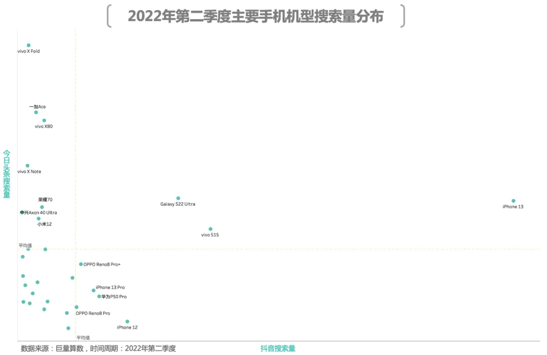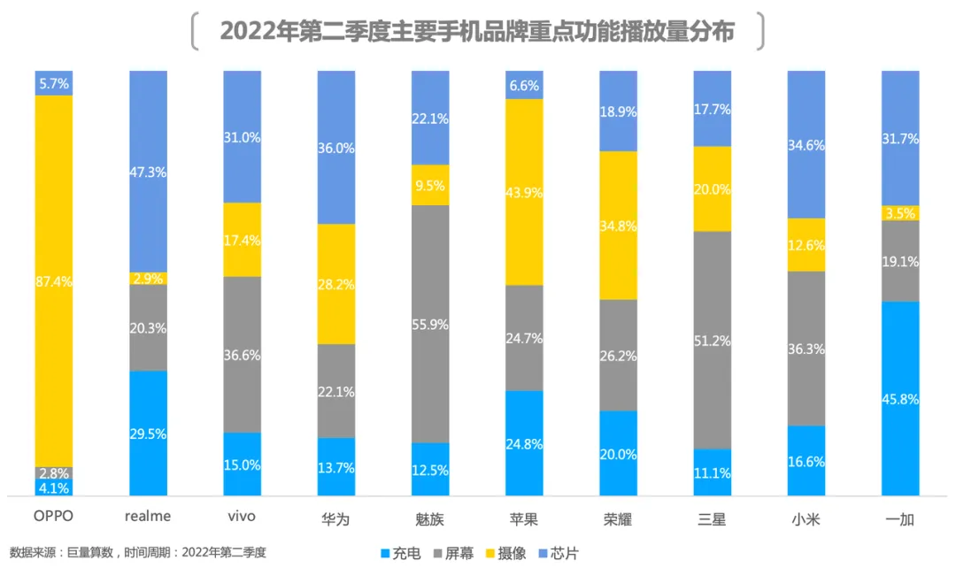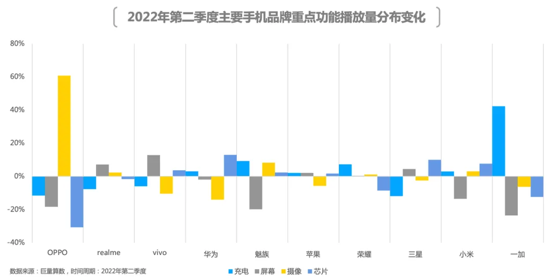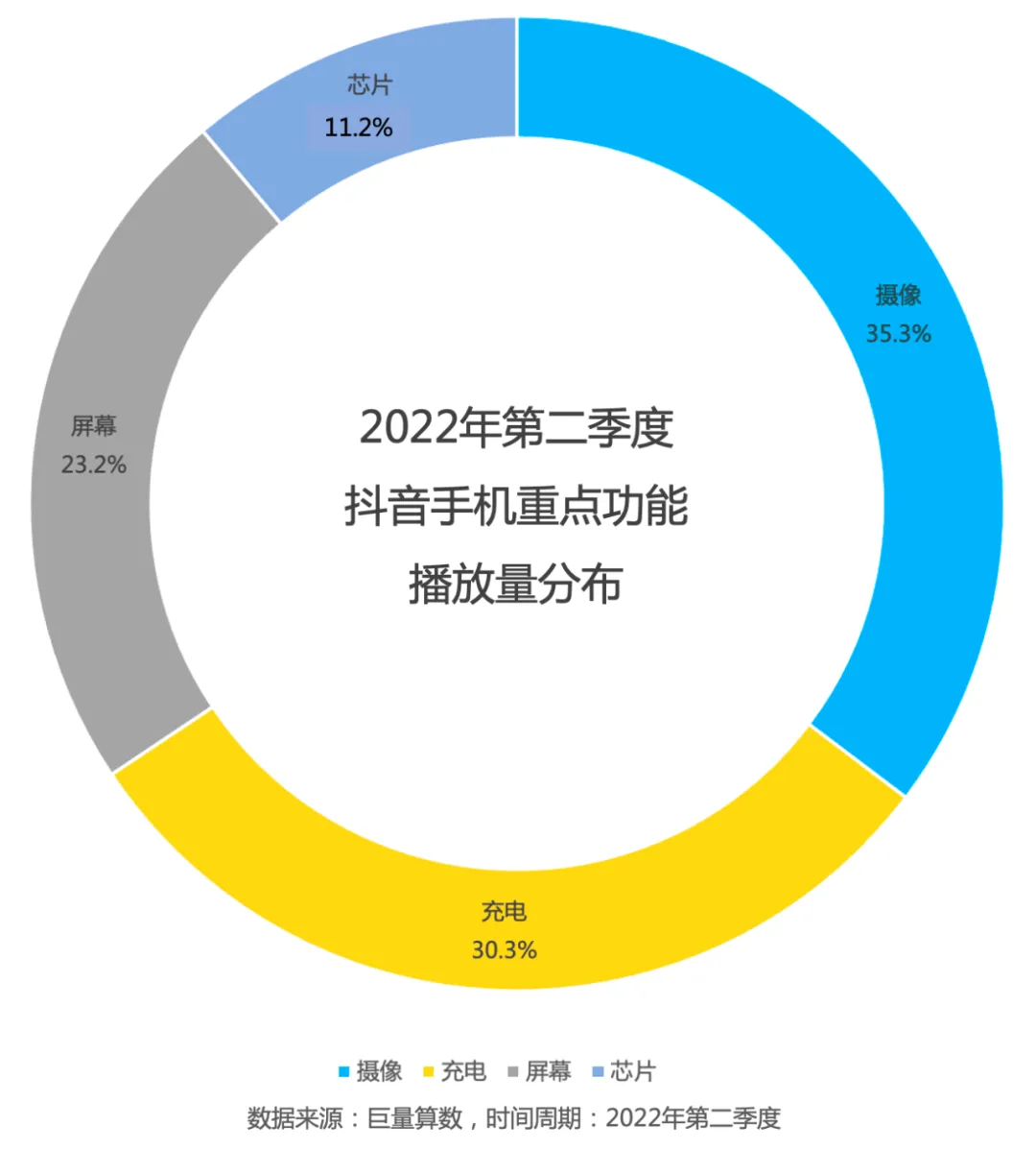 不同于上一季度销售市场与内容平台的冰火两重天,本季度主要手机品牌在内容平台上的表现也出现了低迷,即使第二季度有多个重磅旗舰机型发布,依然没有挽回整个行业的颓势。但也有例外,vivo在第二季度实现了品牌关注度的微涨,这主要得益于S15系列以及X80系列的发布,两个价位段旗舰机型共同推高了vivo品牌关注度,使得vivo位列今日头条手机品牌榜第三位。而小米、OPPO、荣耀等品牌虽然在第二季度发布了重磅机型,但第一季度仿佛是提前“透支”了品牌关注度,本季度均有不同程度的回落。魅族可以说是本季度“最有趣”的手机品牌,春季、夏季两场发布会发布了多款手机周边配件,甚至露营装备。这些花活也推高品牌关注度,环比增幅接近20%。今日头条与抖音有着不同的内容、不同的用户,品牌及产品在两个平台中也有着不同的表现。从第二季度各个机型在两个平台的搜索量分布看,本季度用户主动搜索的重点主要是在旗舰机型上。在今日头条中,搜索量前六的机型中,vivo占据了三席,vivo X Fold拔得头筹,成为搜索量最高机型。而在抖音中,OPPO Reno8系列表现不俗,两款机型进入热搜前六。而iPhone 13、vivo S15以及Galaxy S22 Ultra则成为双平台热搜机型,除了过硬的产品素质外,三款产品同样颇具话题性。从手机厂商角度看,产品功能点既是产品卖点,也是品牌希望对外传达的产品记忆点。而从消费者角度看,产品功能点很大程度上是他们为产品买单的理由。因此,通过对于热门功能的分析,可以看到该期间之内市场对于各类功能的关注状况。本季度抖音手机重点功能播放量分布状况与上季度基本相同,主要变化是摄像取代了充电,成为本季度播放量最高的手机功能。从本季度发布的重点机型来看,不论是小米12 Ultra、OPPO Reno8系列或者vivo的S15以及X80系列,拍照都是主打功能之一。因此摄像功能上位也不足为奇。从不同品牌的重点功能播放量分布看,不同品牌有着不同的功能侧重。而从本季度各个品牌重点功能播放量变化数据可以看到,本季度各个品牌所主打的功能点。数据显示,OPPO在摄像功能上的播放量相较去年提高了六成以上,而一加史上充电速度最快的一加Ace也使得品牌充电相关视频的播放量环比提高了40%以上。