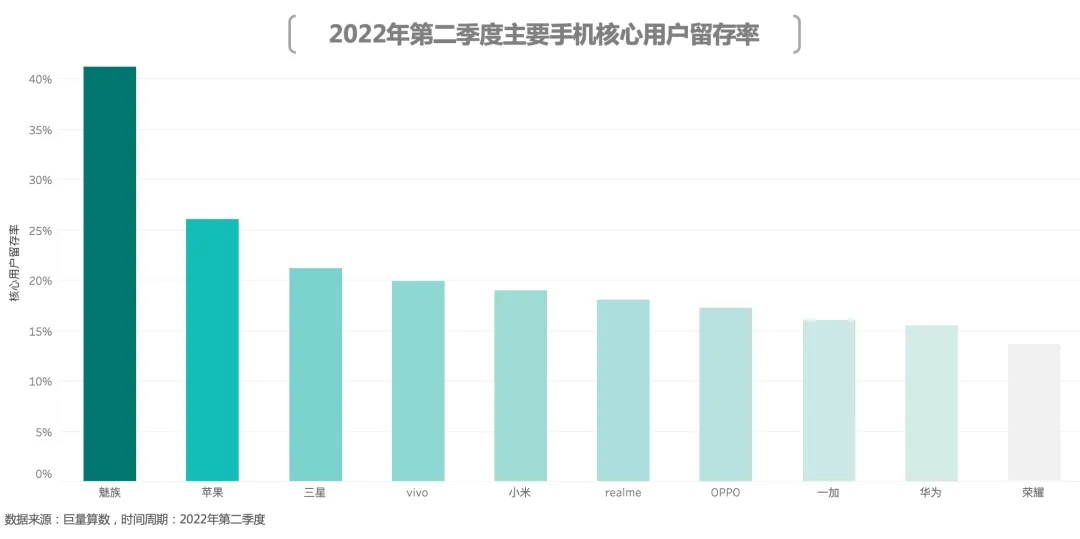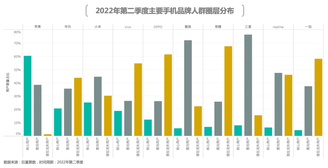 用户购买持机是对品牌最大的认可,而在平台中的点赞行为也许是用户兴趣最为直接的体现。因此,我们根据用户的持机、点赞状态,对品牌人群圈层进行了划分:从本季度各个品牌人群圈层分布看,大致可分为三类品牌:苹果独占一类,核心用户占比接近60%,同时有着相当可观的意向用户,并且潜在流失用户比例也维持在较低水平。