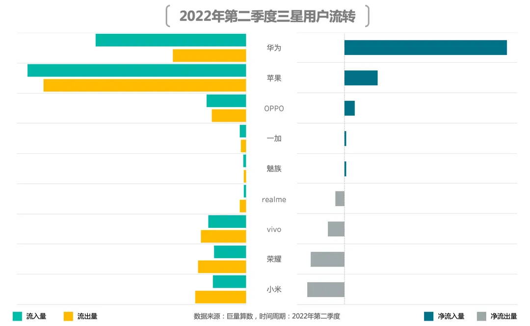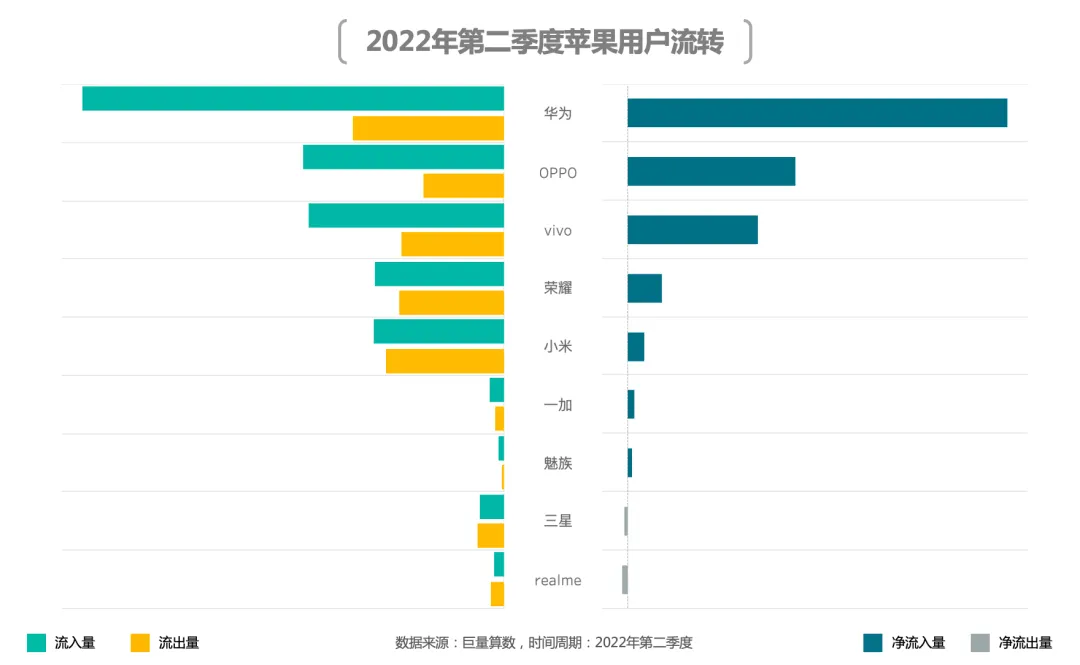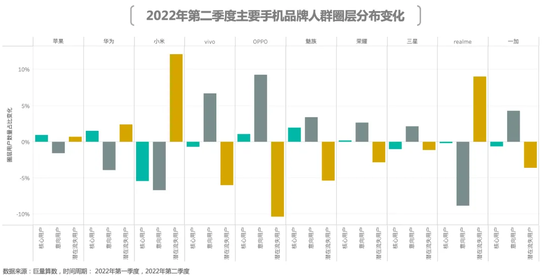 以此标准来看,大部分国产品牌在人群圈层运营上均显不足,上季度核心用户到本季度成为潜在流失用户的比例均在10%以上,甚至部分品牌超过了20%、30%。反观苹果,除了少部分上季度的核心用户流失外,其余圈层均有向好表现。品牌间人群圈层竞争: