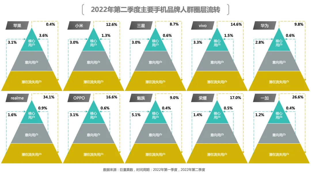 品牌的声量表现、机型推广、市场记忆点打造,归根结底都是在做与用户的沟通。而沟通的最终结果除了体现在销售上,也体现在用户对于品牌的态度上。因此便有了品牌人群的圈层划分。