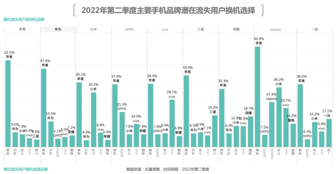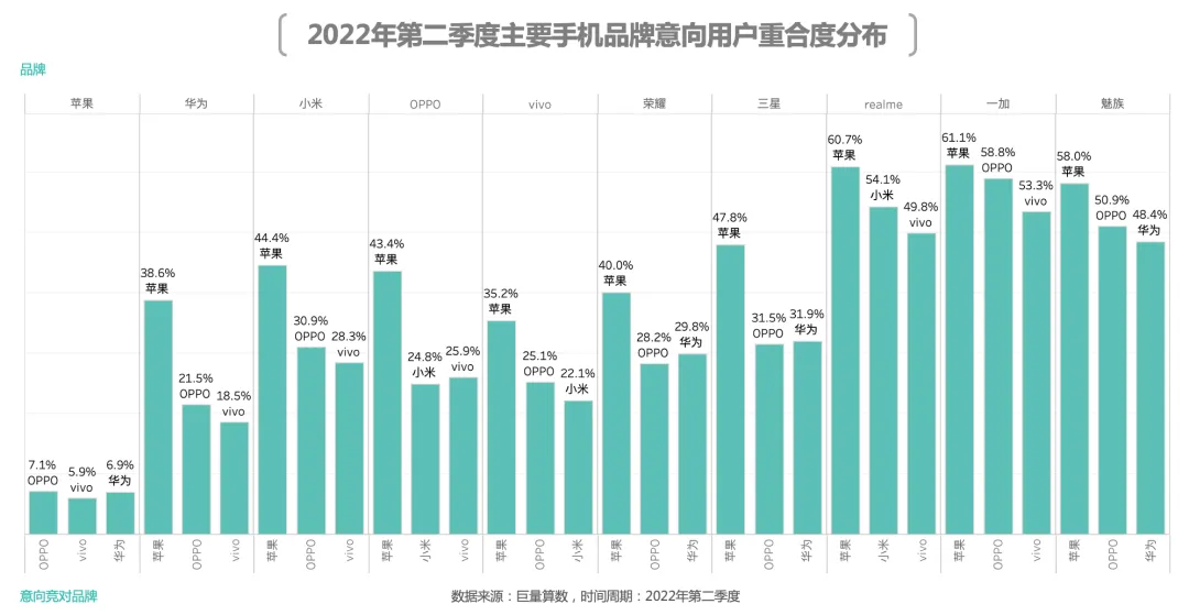 核心用户是品牌的坚定拥护者,是否能够稳定核心用户,对于品牌发展至关重要。与上一季度相比,主要手机品牌的核心用户留存率提升最高的是三星,由上季度的14%提升至本季度的21%。Galaxy S22系列无疑是三星最成功的产品之一,本季度换机至三星的用户中有接近四分之一的用户会选择Galaxy S22系列。好的产品除了可以获取新用户,对稳住老用户的忠诚度也至关重要。我们将点赞品牌视频两次及以上的非持机用户定义为品牌意向用户,然而用户的兴趣往往是广泛而多样的,因此,通过判断品牌的意向用户重合率,可一定程度上验证品牌潜在用户的重合状况以及竞争态势。从数据看,苹果意向用户依然保持着更高的忠诚度,而意向重合率最高的品牌由上季度的小米变为本季度的OPPO。除此之外,本季度OPPO与vivo成为各品牌意向用户竞争的黑马,大部分品牌意向竞对中均有二者身影。然而对于潜在流失用户的最终选择分析,可以从一定程度验证品牌间的竞争状况。本季度大部分品牌潜在流失用户在换机时选择苹果的比例略有下降,选择原持机品牌的比例有所提升。但即将到来的苹果新机,也许会打破此趋势。