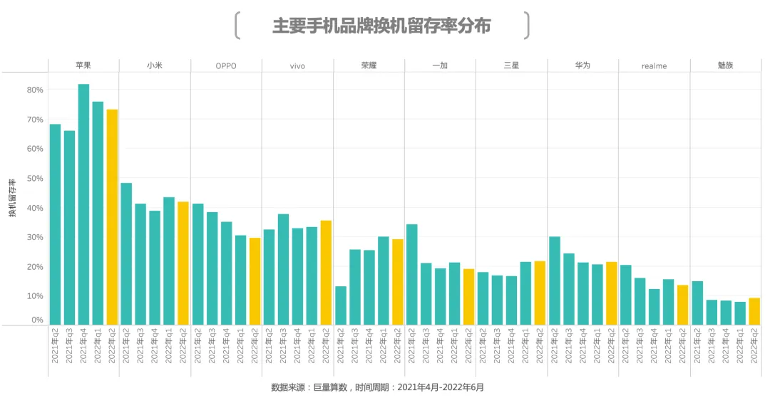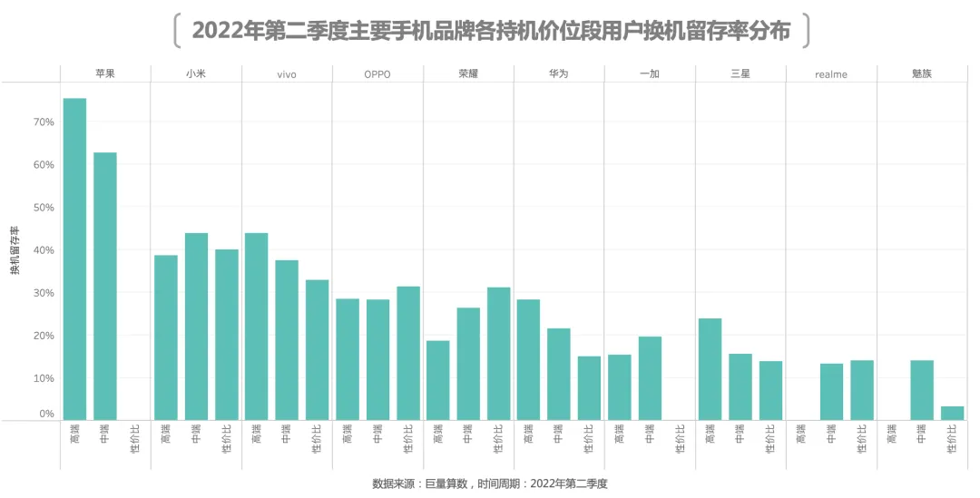 从本季度巨量算数换机数据来看,除vivo之外其他品牌换机留存率均有不同程度的下跌,这也与本季度手机行业整体低迷的态势相吻合。vivo之所以成为本季度唯一一个换机留存率提升的国产品牌,vivo X80系列功不可没。在第二季度换机至vivo的用户中,超过10%会选择X80系列。加之本季度新机S15系列,两个系列合计为vivo带来了近20%的用户。苹果自去年第四季度开始,换机留存率已经连续两个季度下滑,但依然保持在70%以上。今年第三季度苹果新机即将发布,势必会再次拉升品牌换机留存率,对于国产品牌而言,今年下半年依然困难重重。将视角下探到各个品牌不同价格段持机用户的换机留存,品牌间更为明显的差异开始显现。单从本季度的换机数据来看,vivo是国内品牌冲击高端较为成功的品牌,5000元以上高端机型换机留存率超过40%,仅次于苹果。对于独立回归的荣耀而言,虽然品牌整体的换机留存率已经复苏,但主要依靠的是2000元以下性价比机型的贡献,如何更好留住中高端机型持机用户,已成为摆在荣耀面前的一大问题。
