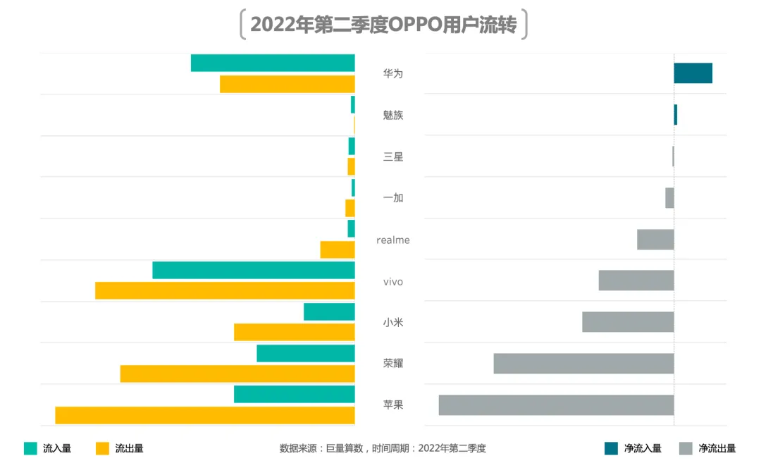 相较于上季度大部分品牌呈现核心、意向用户占比增长,潜在流失用户占比下降的趋势,本季度的各品牌人群变化稍显无序。单从人群圈层分布来看,本季度OPPO表现亮眼,潜在流失用户占比下降超过10个百分点,而意向用户占比有着大幅提升。与其情况类似的品牌还有荣耀及魅族。品牌内人群圈层流转: