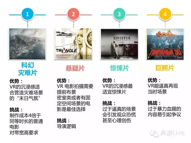结合VR浸入感、场景化强的特点,易观认为,强调场景化、悬疑和惊悚类的电影题材比较适合VR影视。但是,也存在着一些挑战。