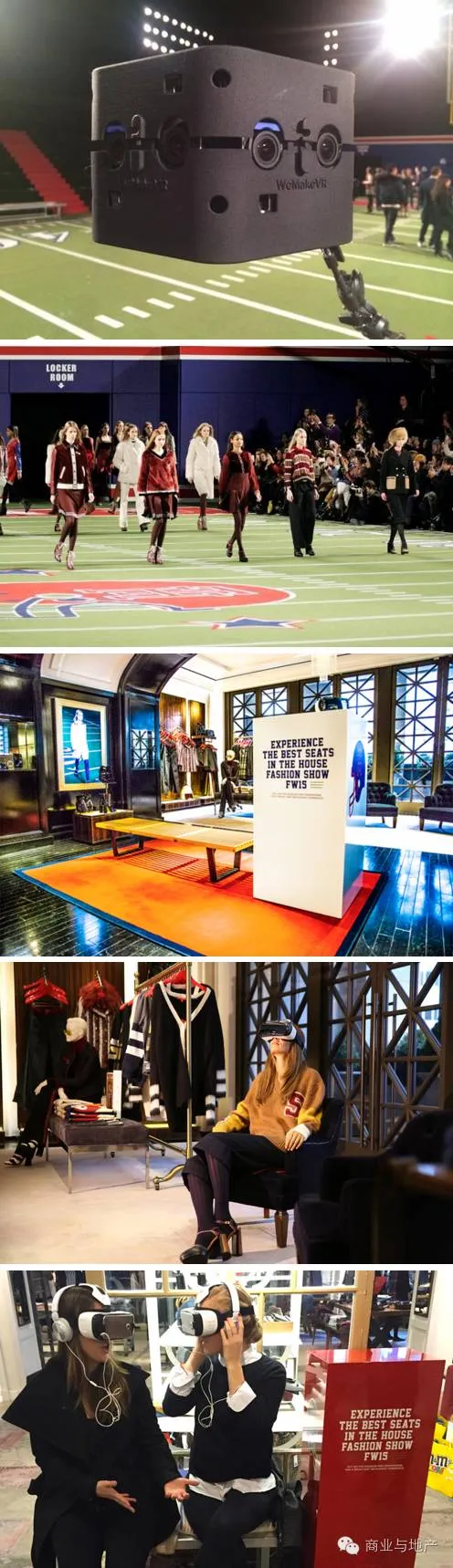 以美国时装品牌 Tommy Hilfiger为例:2015年10月,该品牌与荷兰VR研发团 WeMakeVR合作,在秀场现场使用专业鹰眼镜头相机 WeMakeVR-Falcon全程拍摄盛况并独家揭秘幕后花絮,并在纽约第五大道门店推出店内VR体验。体验者在店内使用三星GearVR设备,VR设备会自动调节最佳视角呈现模特的T台表演。这使得体验者仿佛置身秀场前排,真实感受坐在周围的其他观众,可以360度全景观赏2015年Tommy Hilfiger秋季时装秀。