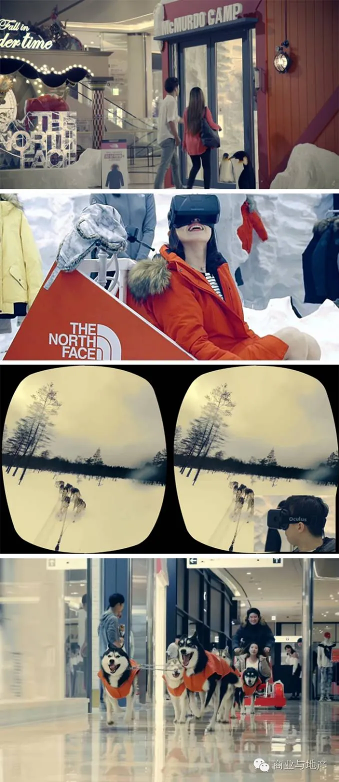 North Face的羽绒服,店员便会邀请顾客坐在雪橇上,带上Oculus Rift头盔,体验冰天雪地中穿着The North Face羽绒服坐在雪橇上奔跑的场景。VR场景体验只是The North Face营销的一部分,另一部分是摘下头盔后,将真的有雪橇犬冲破泡沫墙带着顾客在商场飞奔。这种热闹的营销手法通过社交媒体引起热议,让品牌想要传达的理念与产品得到了广泛传播。