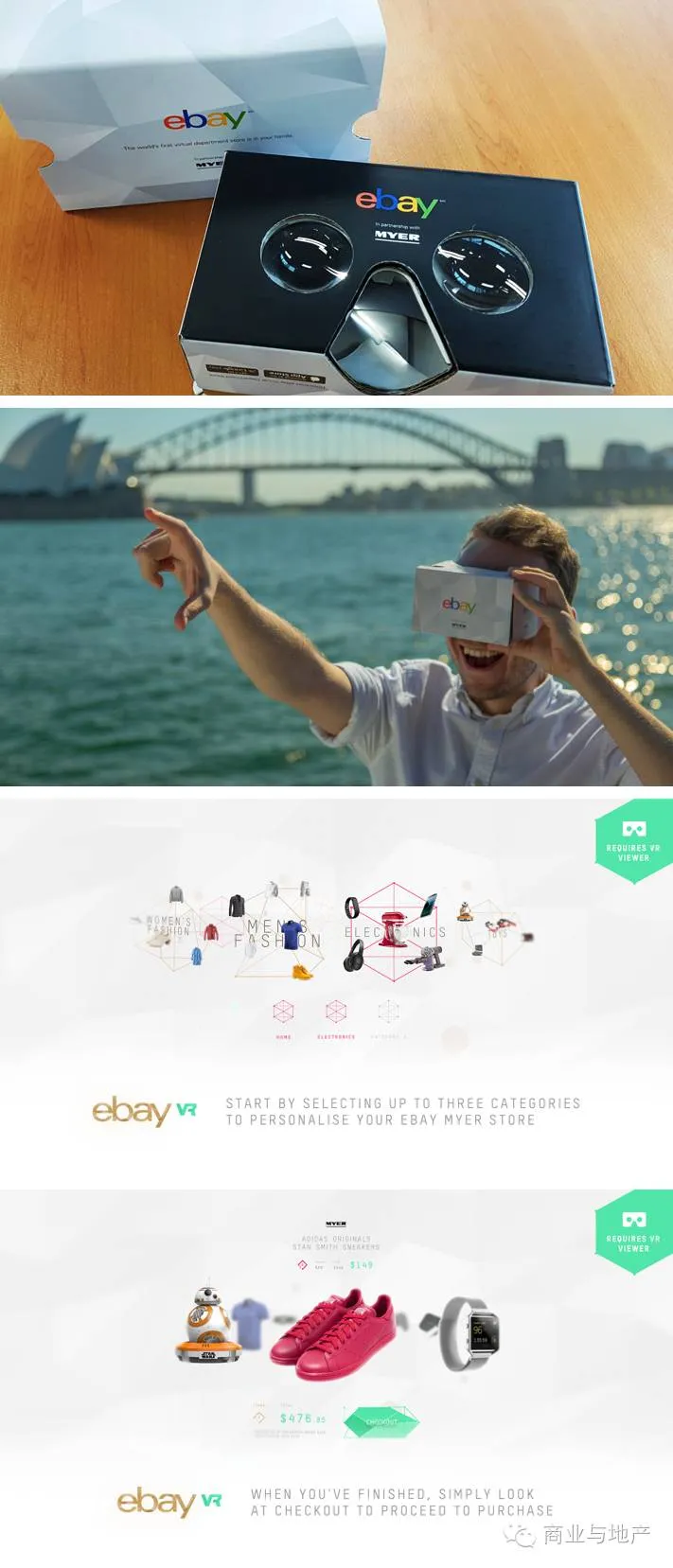 今年5月,美国电商巨头eBay与澳大利亚零售集团Myer携手打造了全球第一家VR百货店,双方联合推出一款虚拟现实头戴设备——名为“shoptical”的纸盒式显示器。通过一只智能手机以及定制 App,购物者就能置身于虚拟现实版的Myer百货,浏览并购买百货店内超过1.25万件商品,App的功能就相当于线上门店的购物车。