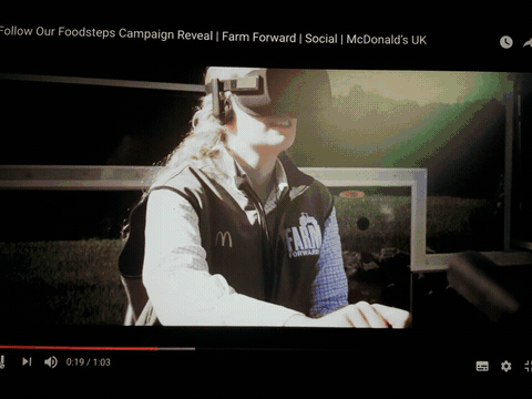 2016年5月,英国麦当劳推出“Follow our Foodsteps” VR体验项目,通过VR将消费者带到麦当劳在英国的农场、工厂和餐厅里,推广麦当劳透明化的产品供应链,并改变消费者对品牌的看法。带上Oculus VR或 Samsung Gear VR头盔,体验者可以在麦当劳的农场里看到食物的来源与制作,并亲自体验用一把农物收割。