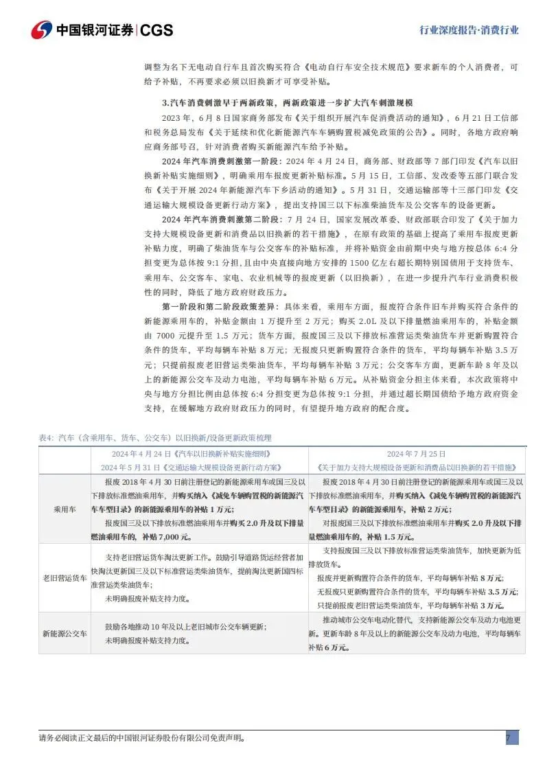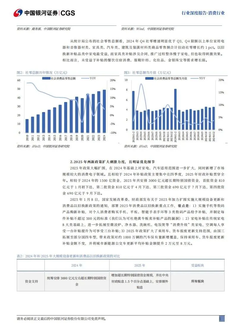 家电、汽车等耐用消费品受益最明显。2024年全年,汽车报废更新超过290万辆,置换超370万辆,带动销售9200多亿元。家电以旧换新涉及八大类产品,全年销售5600多万台,销售额2400亿元。家装厨卫相关产品销售额1200亿元,电动自行车以旧换新销售额超37亿元。统计显示,Q4家用电器、家具、汽车、建筑及装潢材料合计拉动社会零售总额增长约1个百分点。相比之下,未获得补贴的餐饮住宿、服装、化妆品等品类表现疲弱。