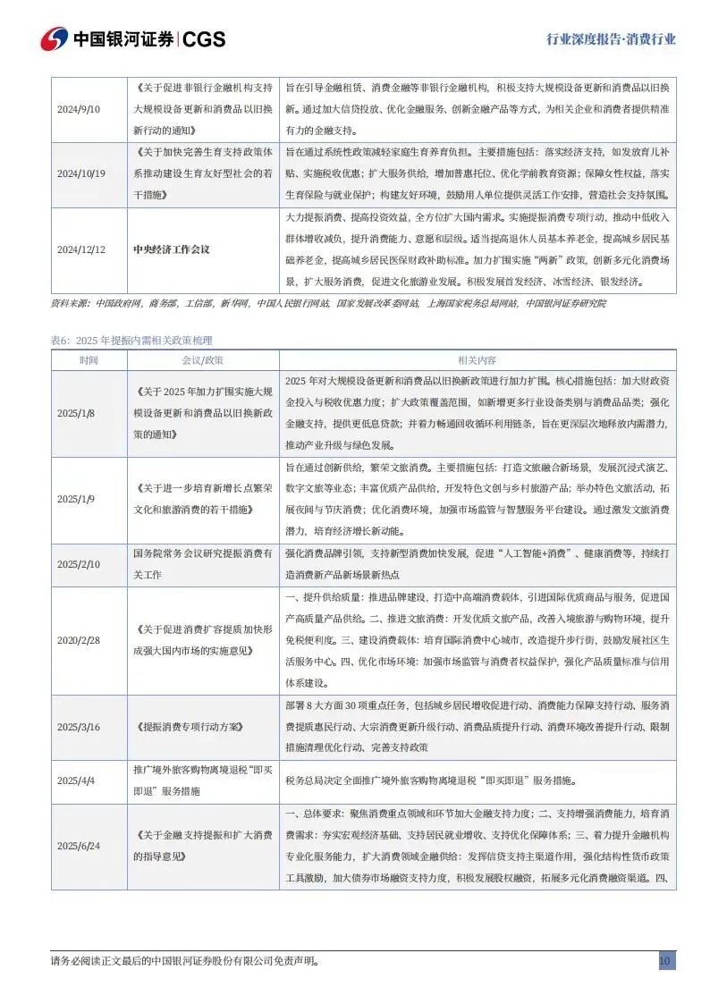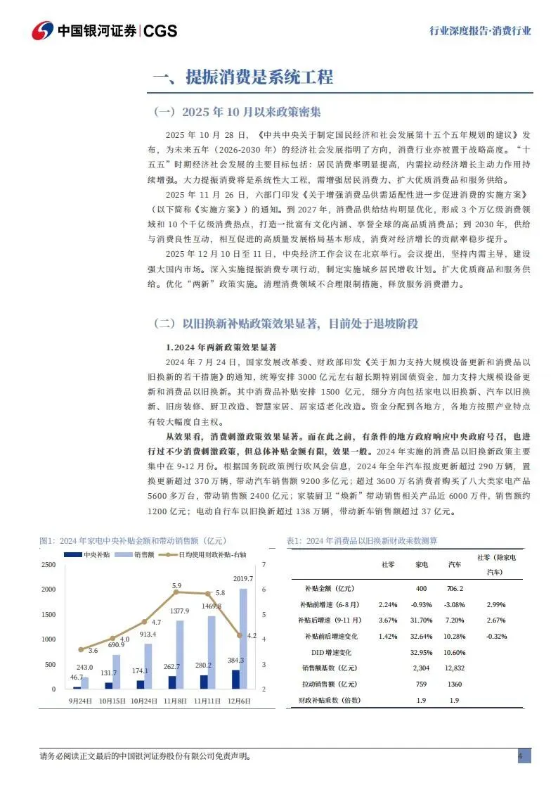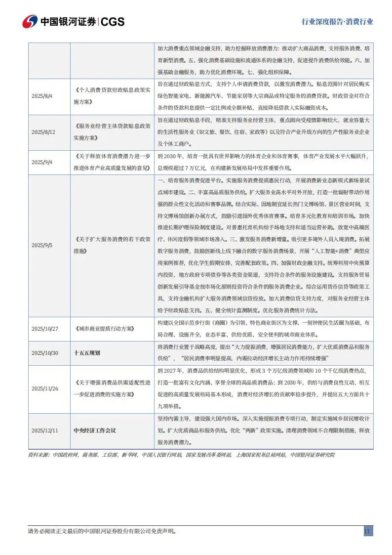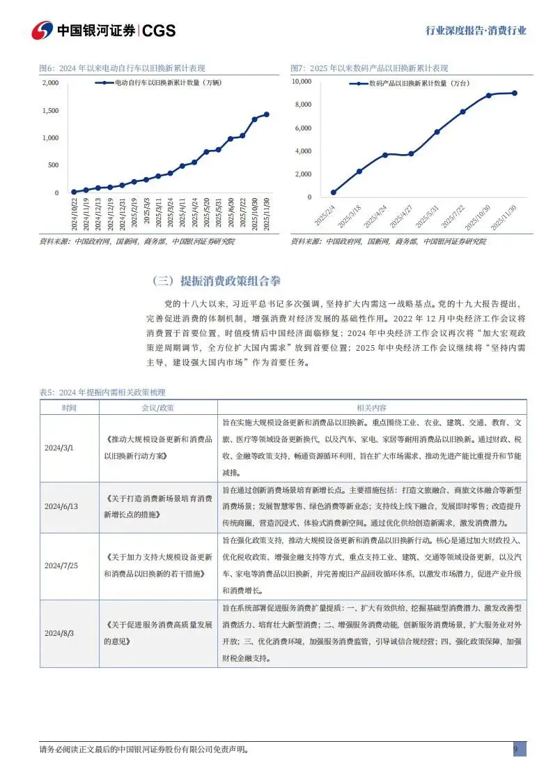 2025年以来,全球消费依然面临多重压力。欧美高关税、高利率持续推高物价,信贷需求疲软,直接压制了消费意愿。中央经济工作会议把“提振消费”摆在内需主导、强大国内市场的核心位置,提出深入实施专项行动,制定城乡居民增收计划,扩大优质商品和服务供给,优化“两新”政策执行,同时清理不合理消费限制。近期,服务消费在政策层面获得更多关注,释放服务需求成为关键。在商品端,国补政策全面推进,2024年起以旧换新与设备更新双线并进,3000亿元特别国债专项投向家电、汽车、消费电子、旧房改造、居家适老等领域,极大带动了行业相关需求。