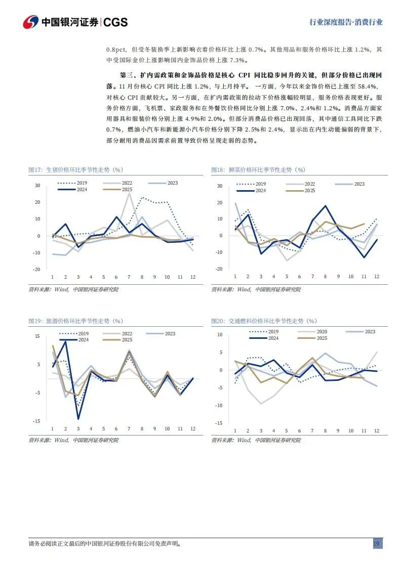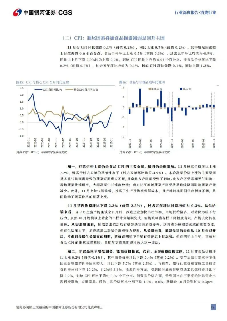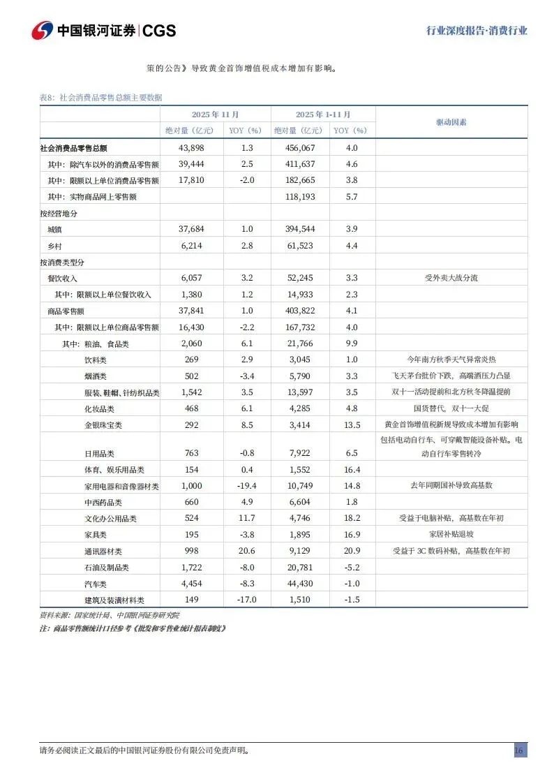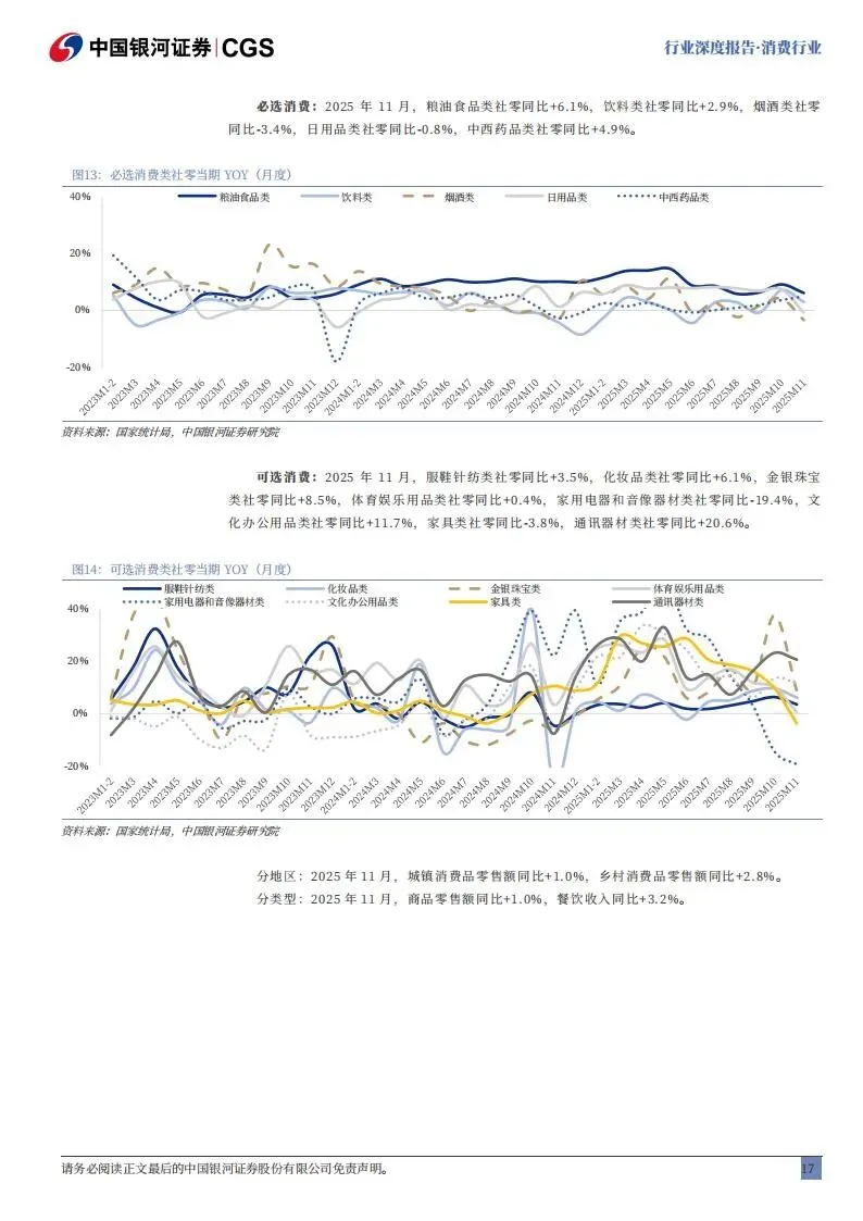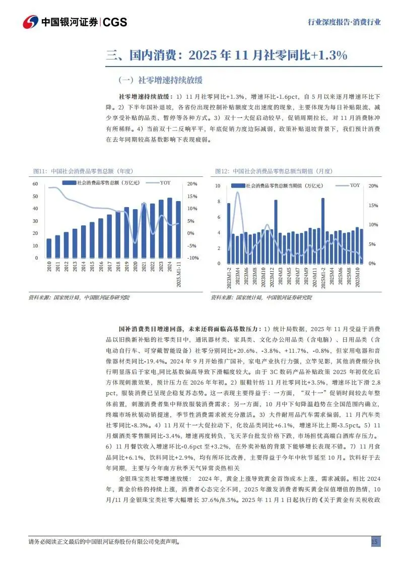 最新数据显示,2025年11月社会消费品零售总额同比仅增长1.3%,环比回落,国补退坡影响已现端倪。家用电器和音像器材类同比下降19.4%,汽车同比-8.3%,家具类同比-3.8%,但通讯器材类同比增长20.6%,化妆品同比+6.1%,食品饮料和日用品增速小幅回升。金银珠宝类受黄金增值税新政影响,10/11月分别大涨37.6%和8.5%。家电行业政策执行力强,其他品类基数高、补贴覆盖弱,表现持续承压。服装、鞋帽类在促销和气温变化带动下环比转好。化妆品受益于双十一促销,增速保持稳定。餐饮方面,外卖补贴支撑下,11月餐饮收入同比增长3.2%,仍低于疫情前水平。饮料类、食品类同比小幅改善。